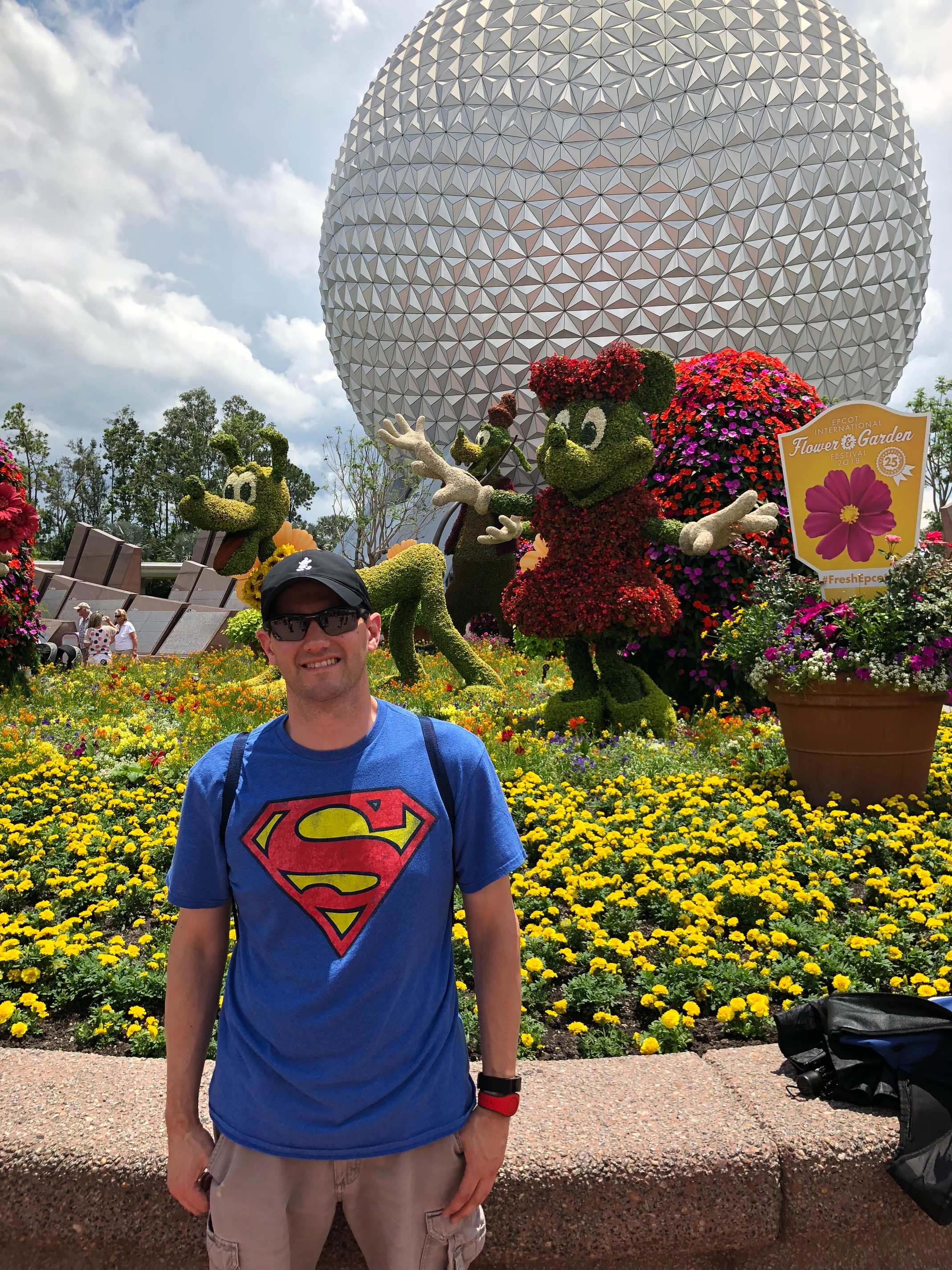 I get back to Epcot and before I have a chance to get into Future World, a family stops me to help them take a photo(I forgot I was wearing my Superman shirt. I noticed people are more willing to approach you when you’re wearing the symbol than any other shirt, especially in Epcot). I happily help out and (hopefully) take a decent photo of them. Immediately afterward, I figure I should take myself, so I position myself for a selfie when the dad sees me and offers to return the favor. I don’t object and he takes a photo.