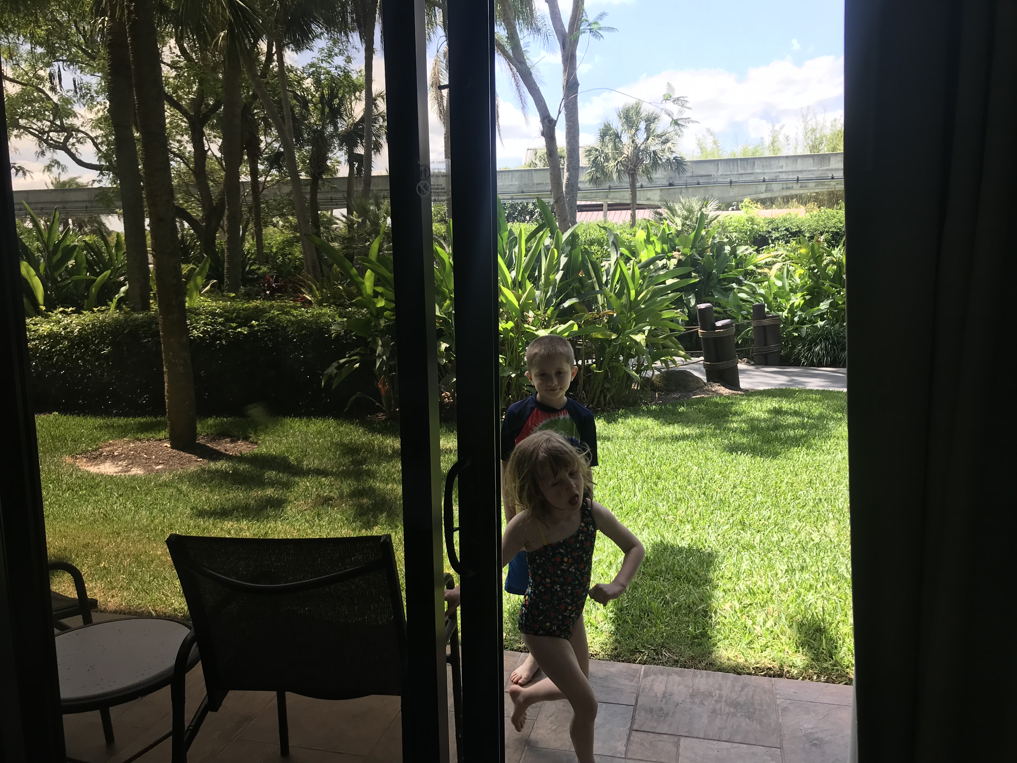 Is the patio fenced in or open to the yard? It sounds so cool watching the monorail from your room. My son would just freak out if he could eat breakfast and watch the monorail. I sent a room request, fingers crossed. How bad was the walk to the main pool and lobby? Thank you! Only 3 more days to go!