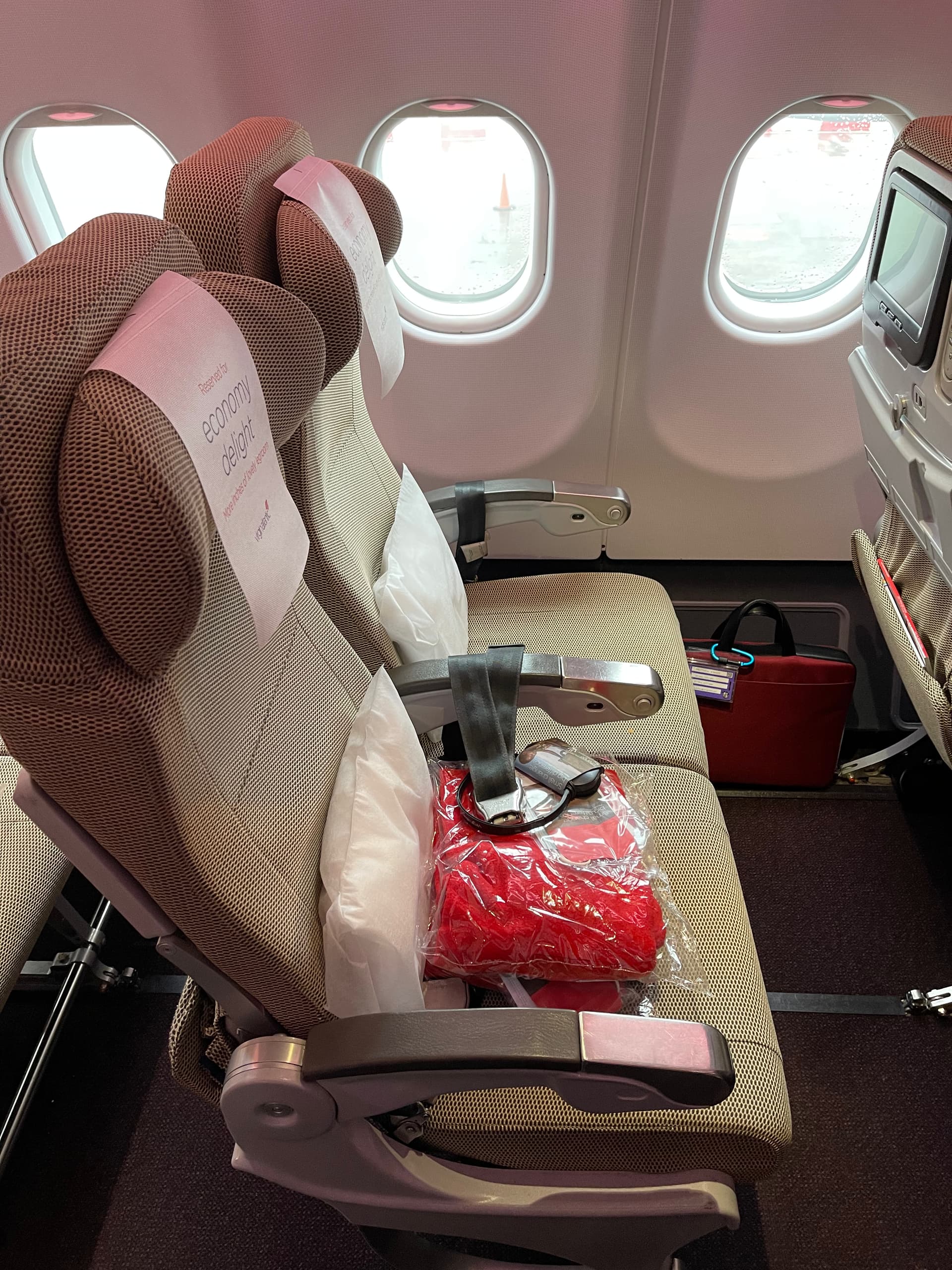 Boarding is complete. I have both seats to myself and the armrest in the middle folds up. No-one in the two seats in front. Or the first seat across the aisle.
