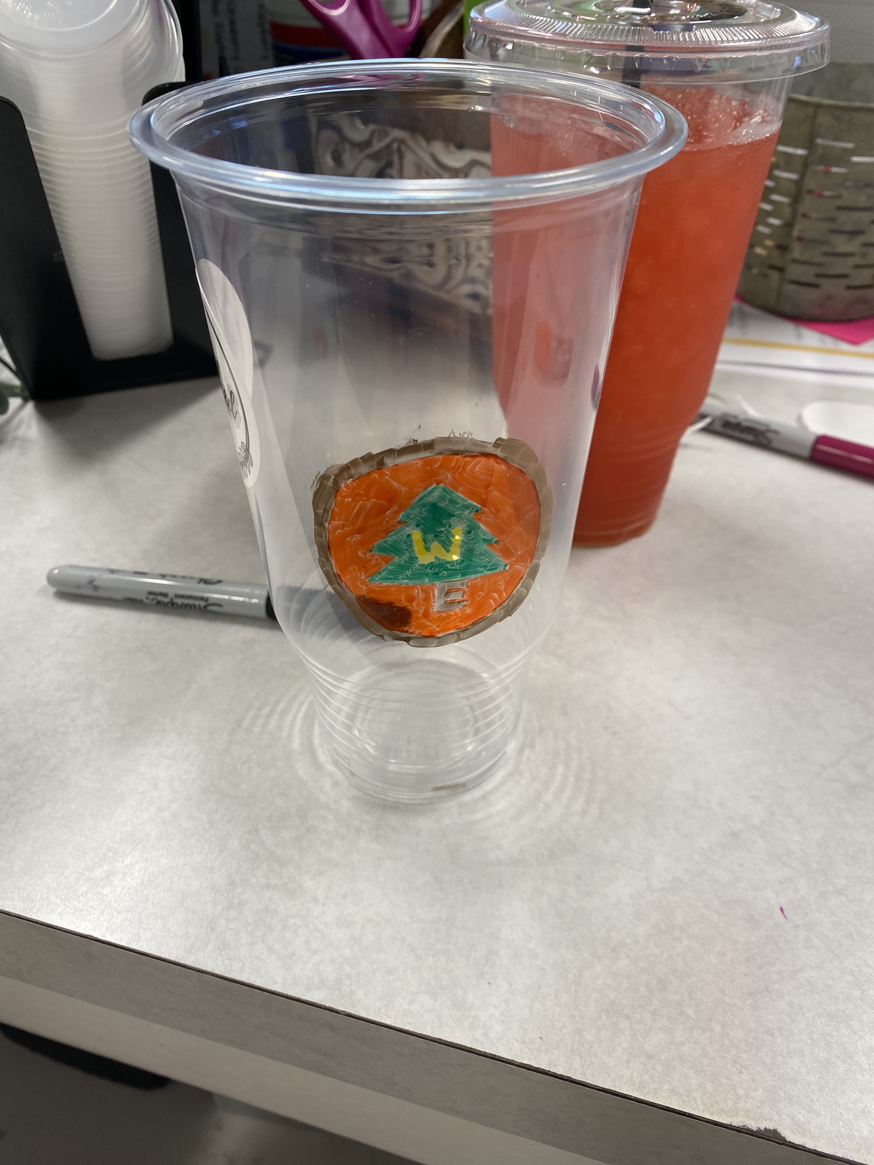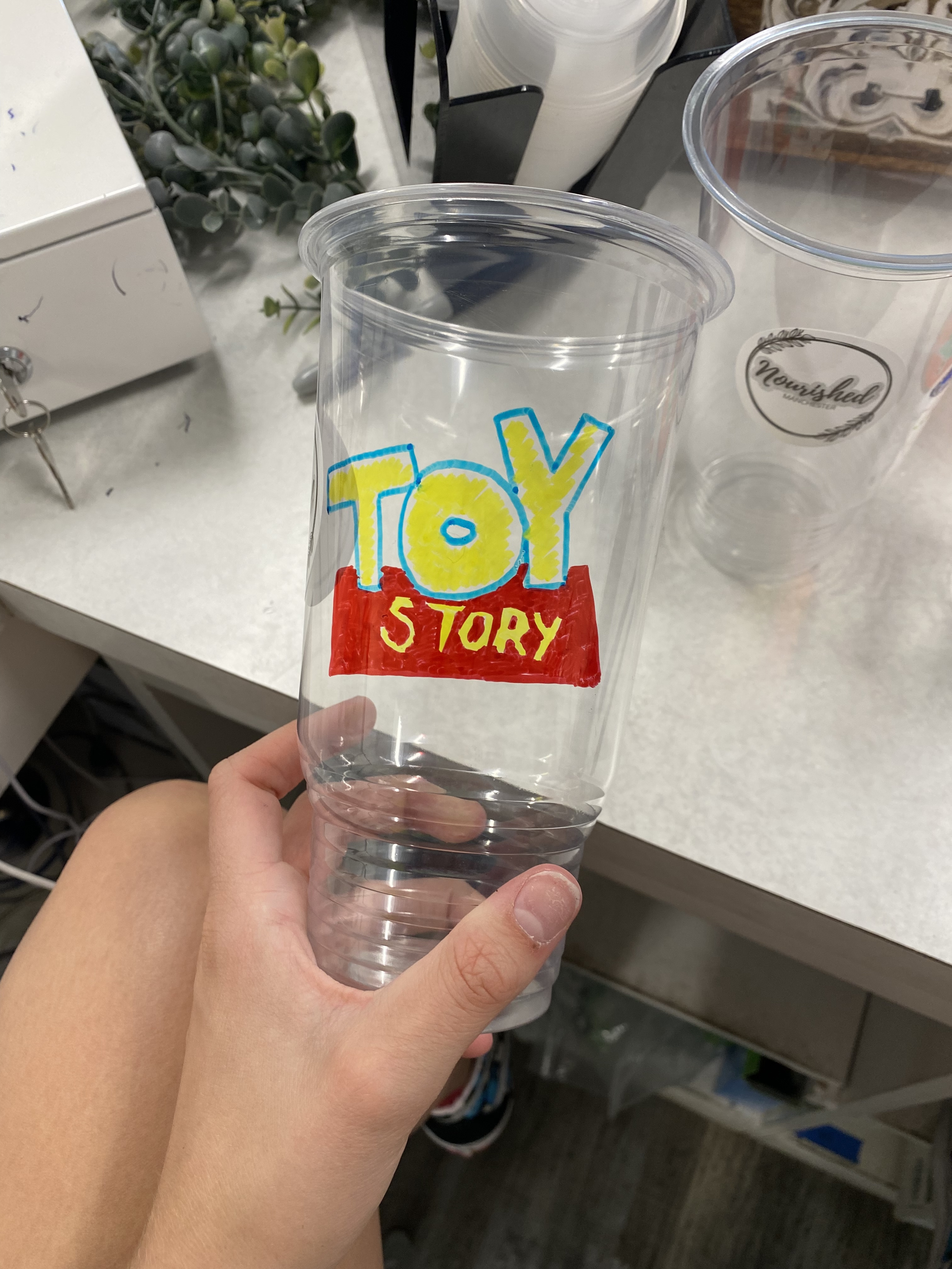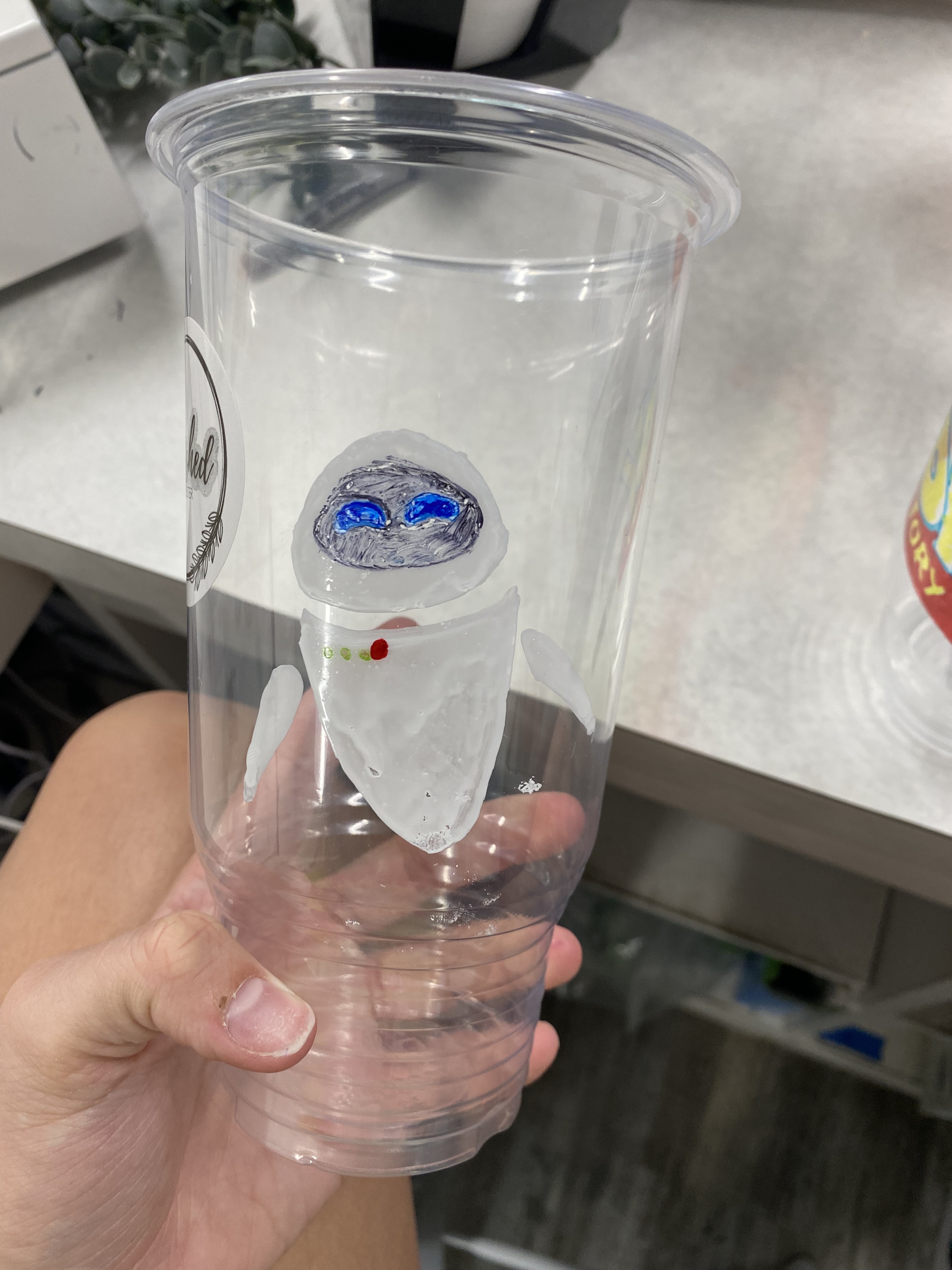 DD17 is working at a locally run specialty tea and smoothie store. They customize their cups for their customers with little drawings and motivational messages. It’s cute.