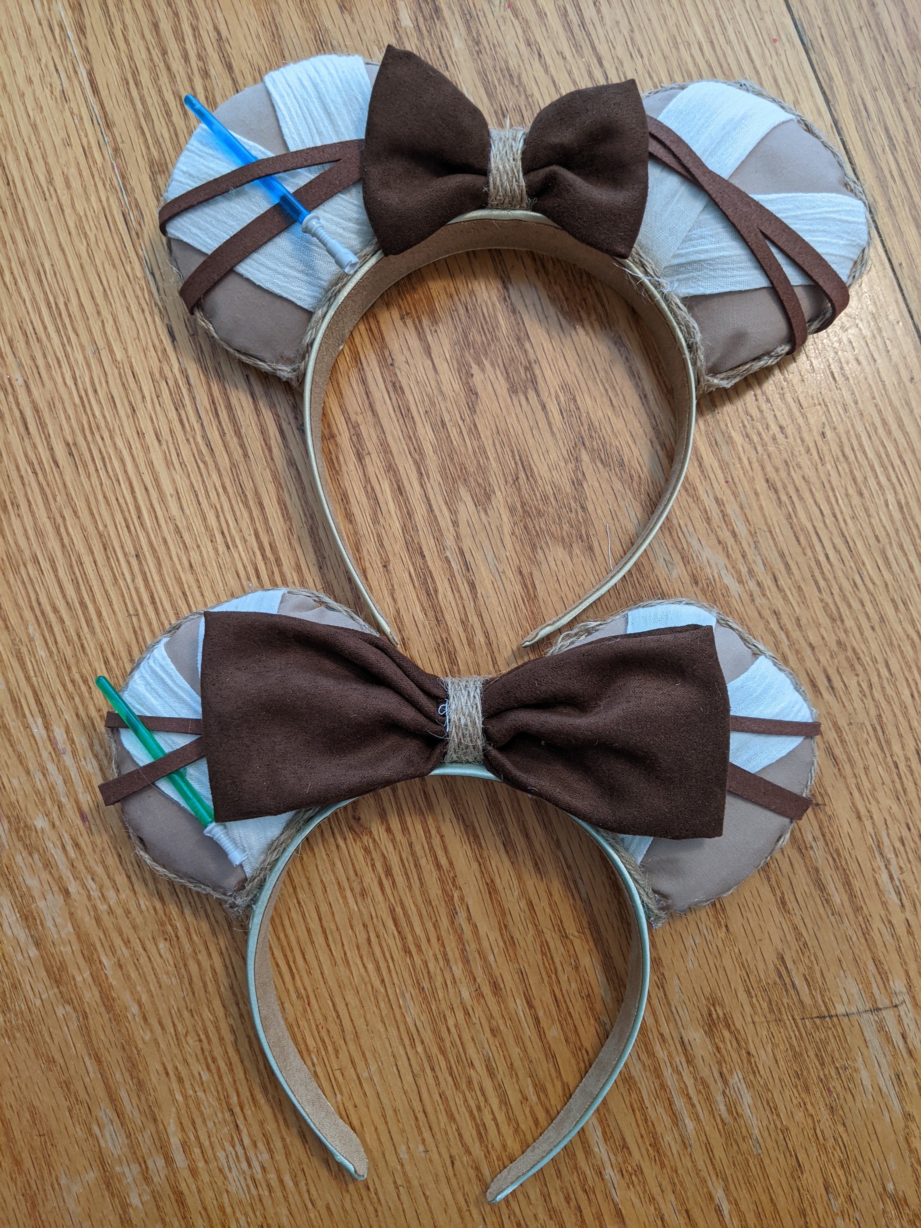 I made some minnie ears yesterday! They are far from perfect, but I’m pretty proud of them for my first attempt. I am not sure that I like the larger bow on the Rey inspired ears; I was thinking that I would wear the larger bow and DD11 would wear the smaller bow, but the large bow really covers up a lot.I have one more pair to make that is Nightmare Before Christmas themed, to wear to Boo Bash (DD7 is going as Jack and I am going as Sally. DD11 will be wearing her Rey costume with the ears pictured here, and DS12 will be Luke Skywalker!) They’re really fun to make, but so time consuming!