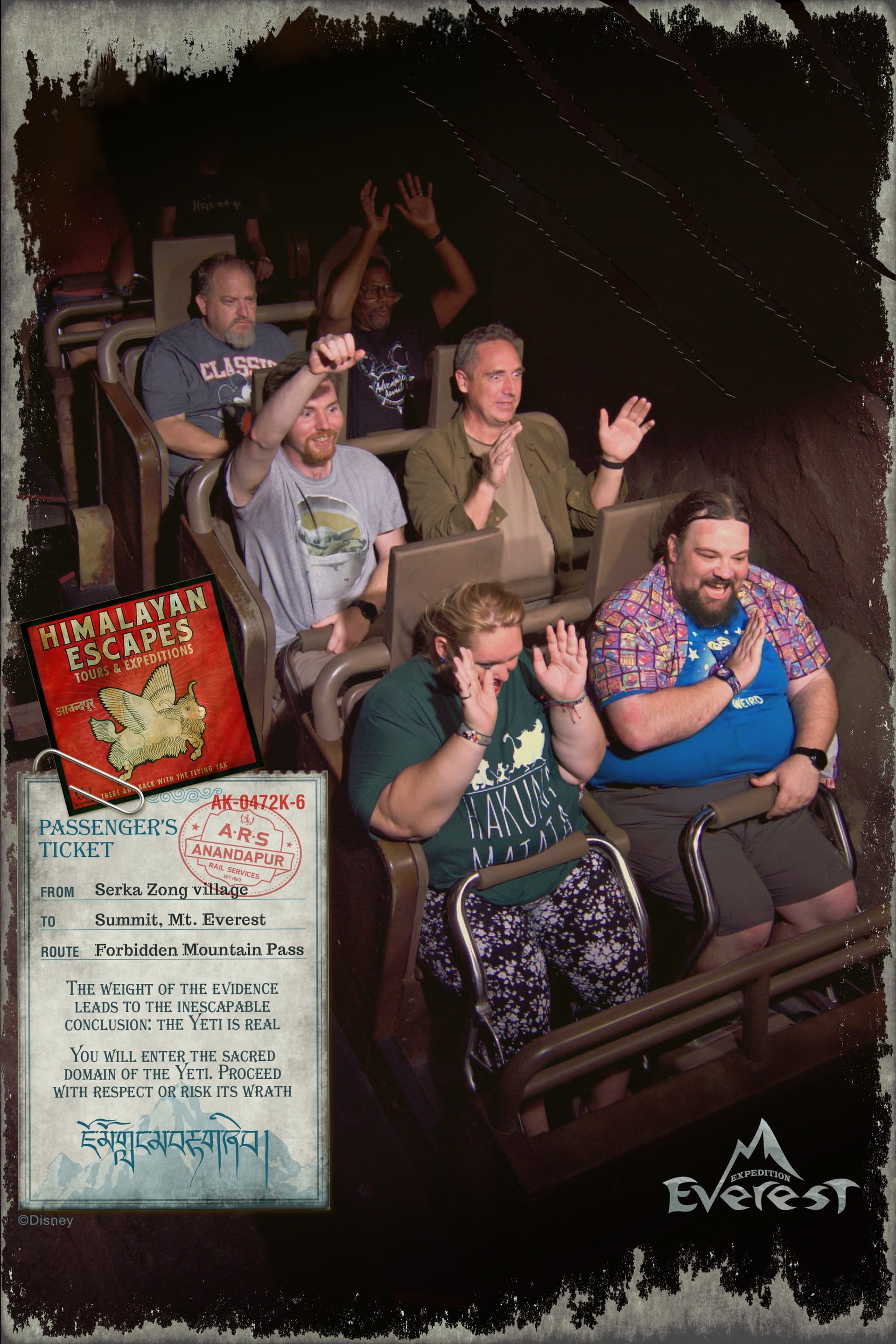 To cap off their Animal Kingdom adventure, the group set their sights on Expedition Everest. As twilight descended, some members of the party chose to sit out this particular escapade. Those who braved the Yeti’s domain discovered a delightful surprise - the standby line was a mere walk-on. Despite having Lightning Lane passes at the ready, they hardly seemed necessary. The allure of Everest after dark proved irresistible, and our intrepid adventurers found themselves riding not once, not twice, but thrice! With each round, however, their numbers dwindled, until only the most daring (or perhaps, the most foolhardy) remained.