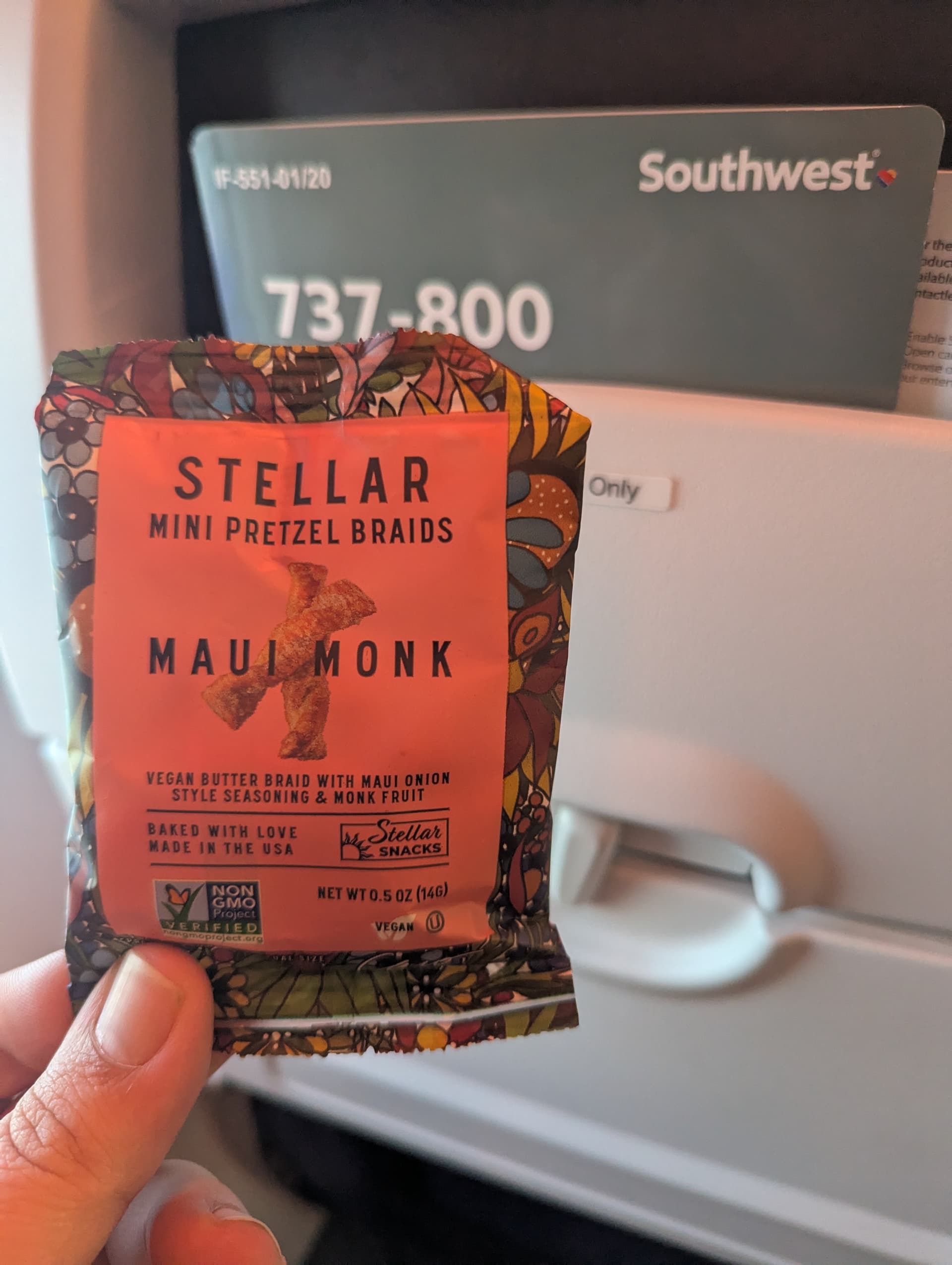 At last, sustenance arrives! A packet of mini pretzels and a splash of OJ - a far cry from the exotic POG juice that awaits in the promised land. Our hero, showing restraint worthy of a Disney Imagineer on a budget, saves the pretzels for later. After all, one must prepare the palate for the culinary delights of Epcot’s Food & Wine Festival!