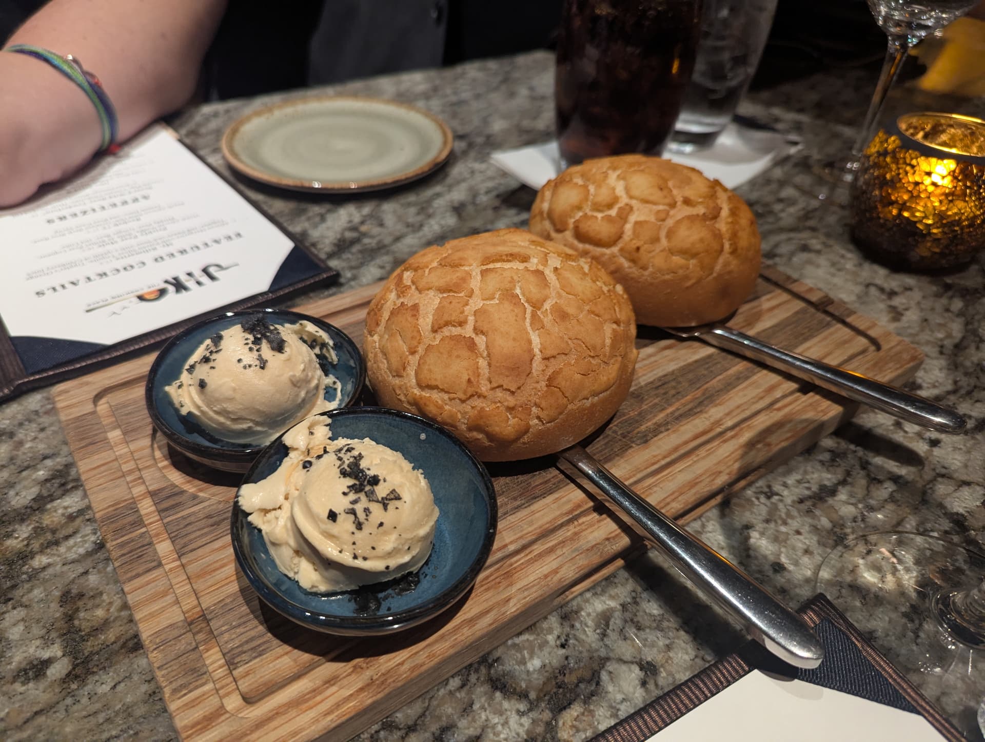 Upon being seated, warm moist washcloths were presented, prompting resident jokester Mark to quip about it being his first shower of the week. The bread service swiftly followed - Giraffe bread with house butter, served warm enough to make even Simba purr with delight. gMagicScott bestowed upon it a noble 4-star rating.
