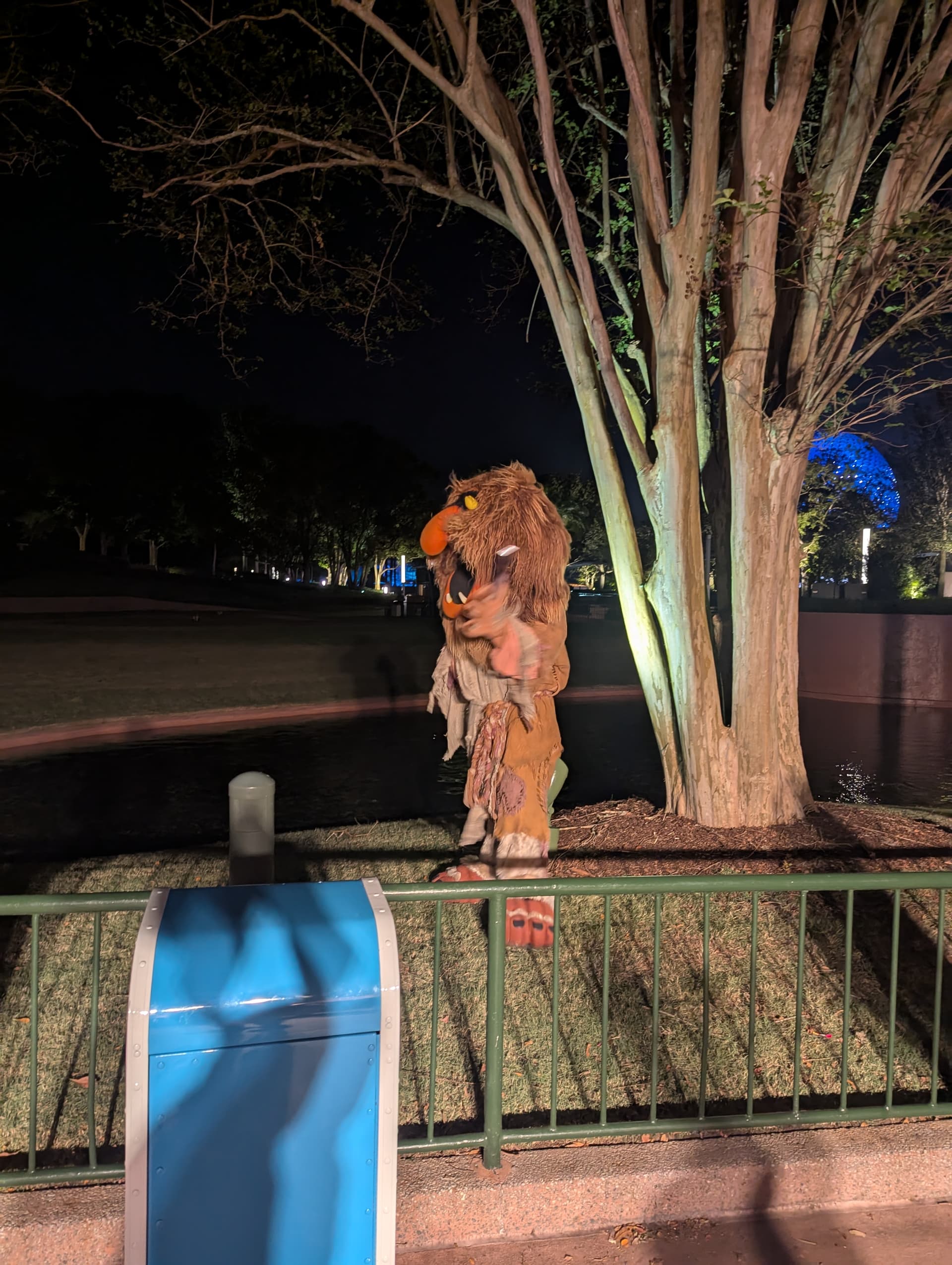 Bean Bunny, having strayed far from his Muppet Theater home, with Sweetums in hot pursuit outside the Imagination Pavilion