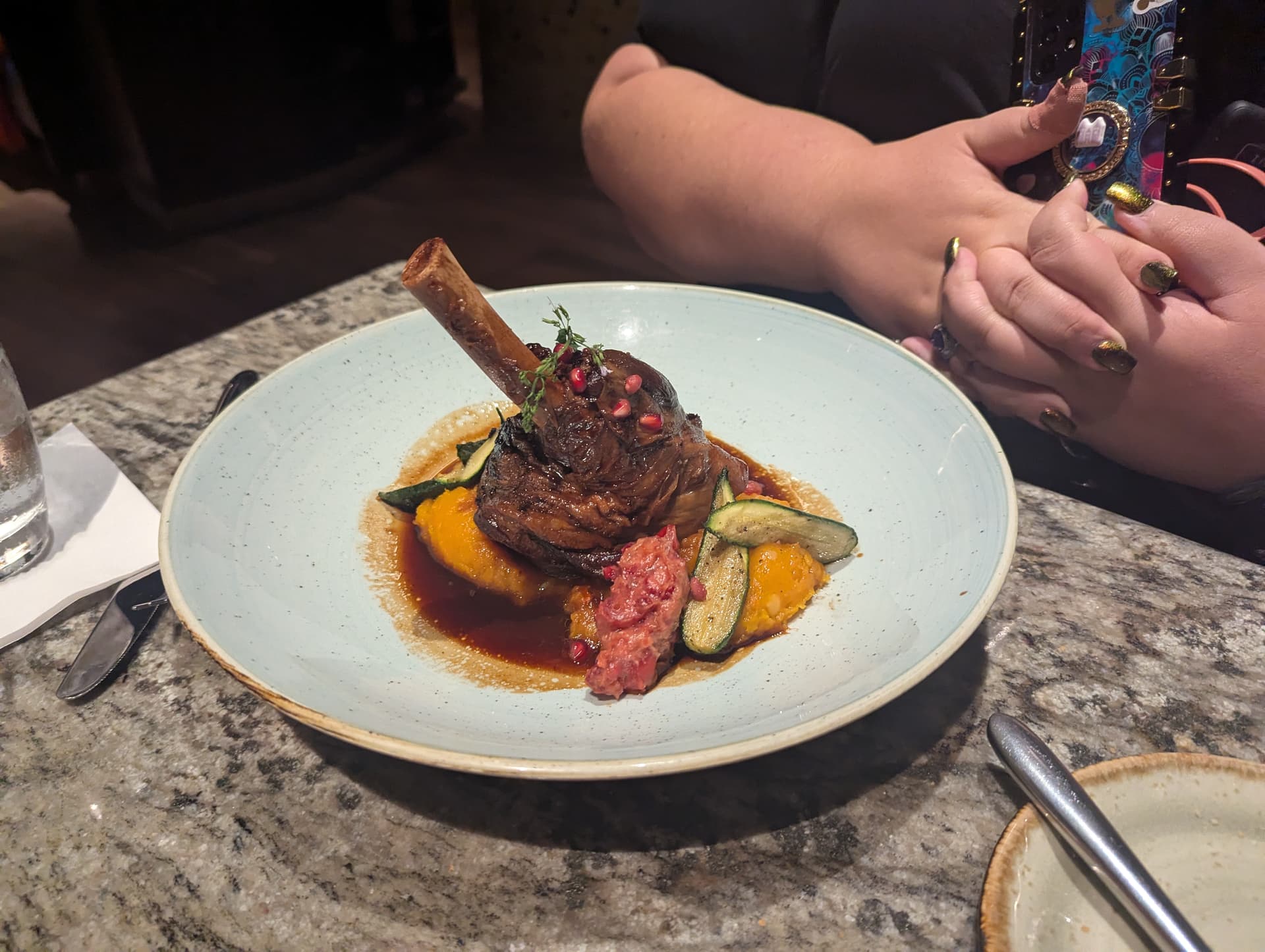 gMagicScott’s choice of Duck Confit and Honey-Raisin Flatbread proved to be a returning champion. With a subtle zing that our hero hesitated to even call spicy, this 5-star appetizer set the stage for the main event.