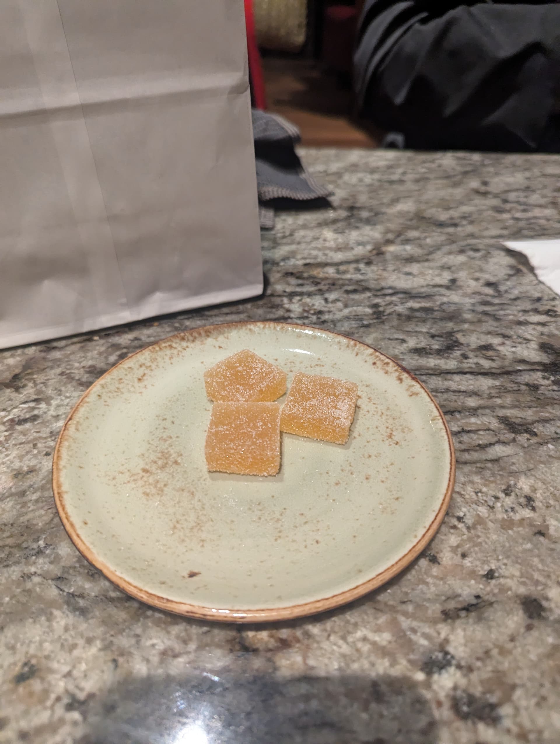 As if by magic, a final sweet treat appeared alongside the check - four squares of house-made fruity gummy candy. In a moment of forgetfulness (or perhaps overeager anticipation), Carroll momentarily neglected the sacred rule of “camera eats first,” leaving only three squares for the photo op. This delightful surprise earned a respectable 4 stars from our discerning hero, proving that even the smallest treats can leave a lasting impression.