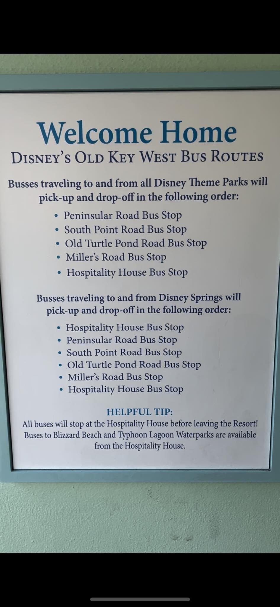 Here’s the basic bus route to my recollection. The first stop is on the main road (Peninsular Road), which is across the street from Hospitality House. Close enough to walk relatively quickly. Then it loops toward the end of the resort (stops 2 and 3), comes all the way back to Miller Road (stop 4), and finally stops at Hospitality House (stop 5) before leaving the resort. I am not aware of whether they sometimes send a bus directly to Hospitality House.