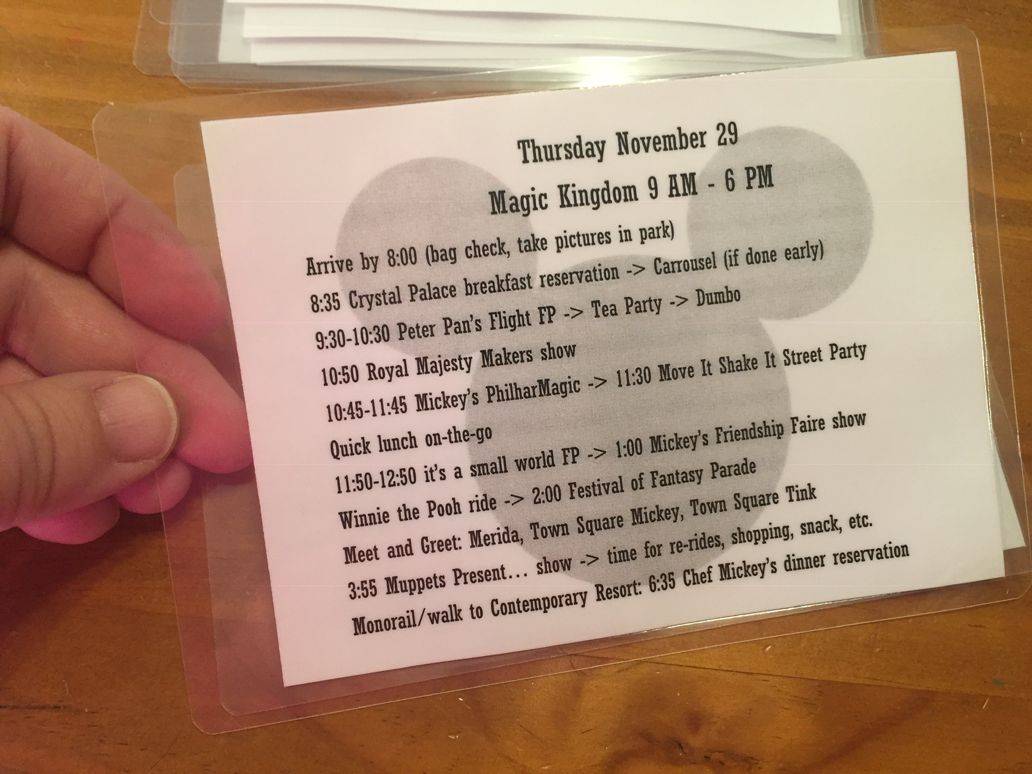 I made these little “cheat sheets” with times for ADRs and FPPs, and had the order of things put in between. So we had an idea of the order of things but it left some flexibility. I only used the Disney app for finding SDFPs in the park, didn’t use the TP app in the park. Next trip I want to try and submit wait times tho