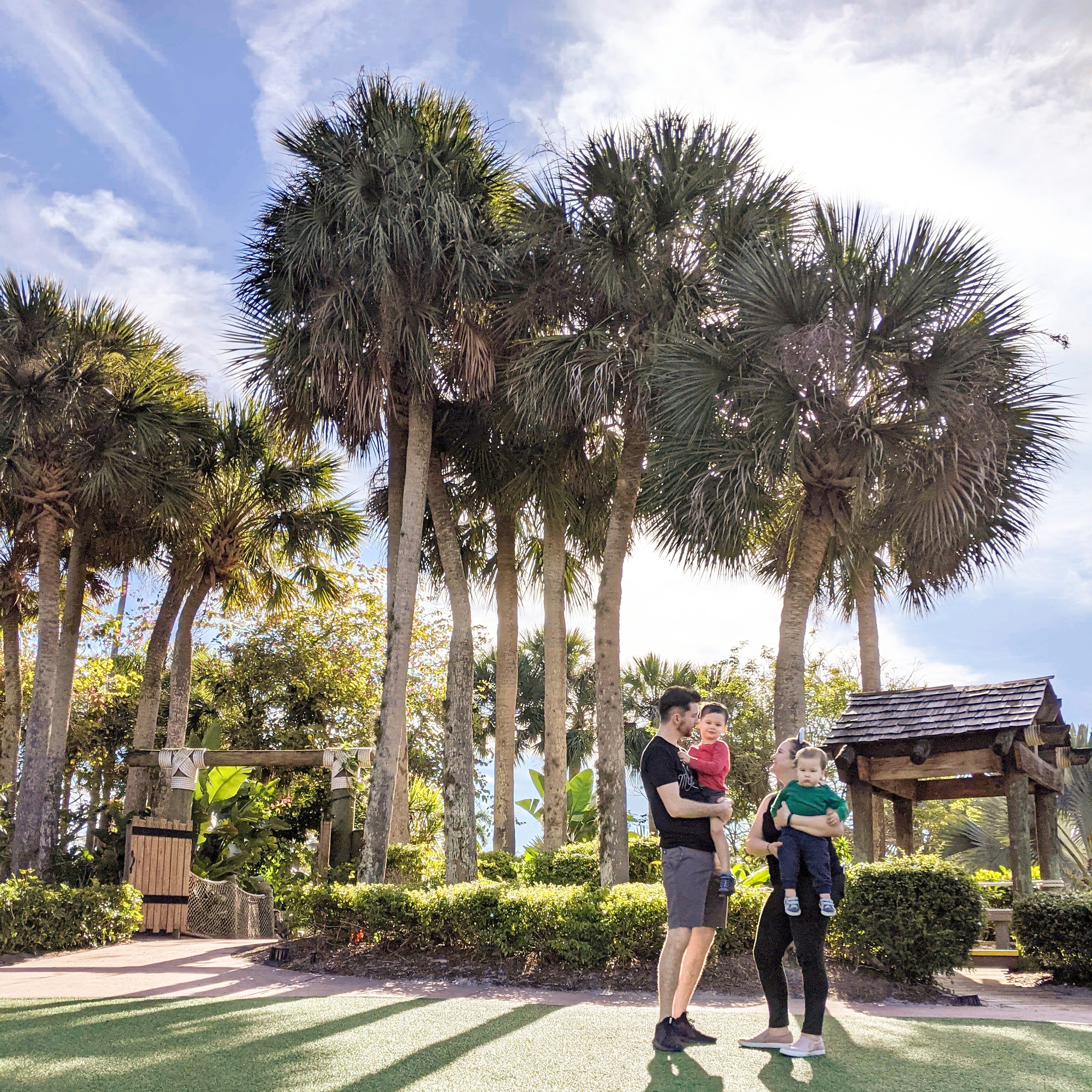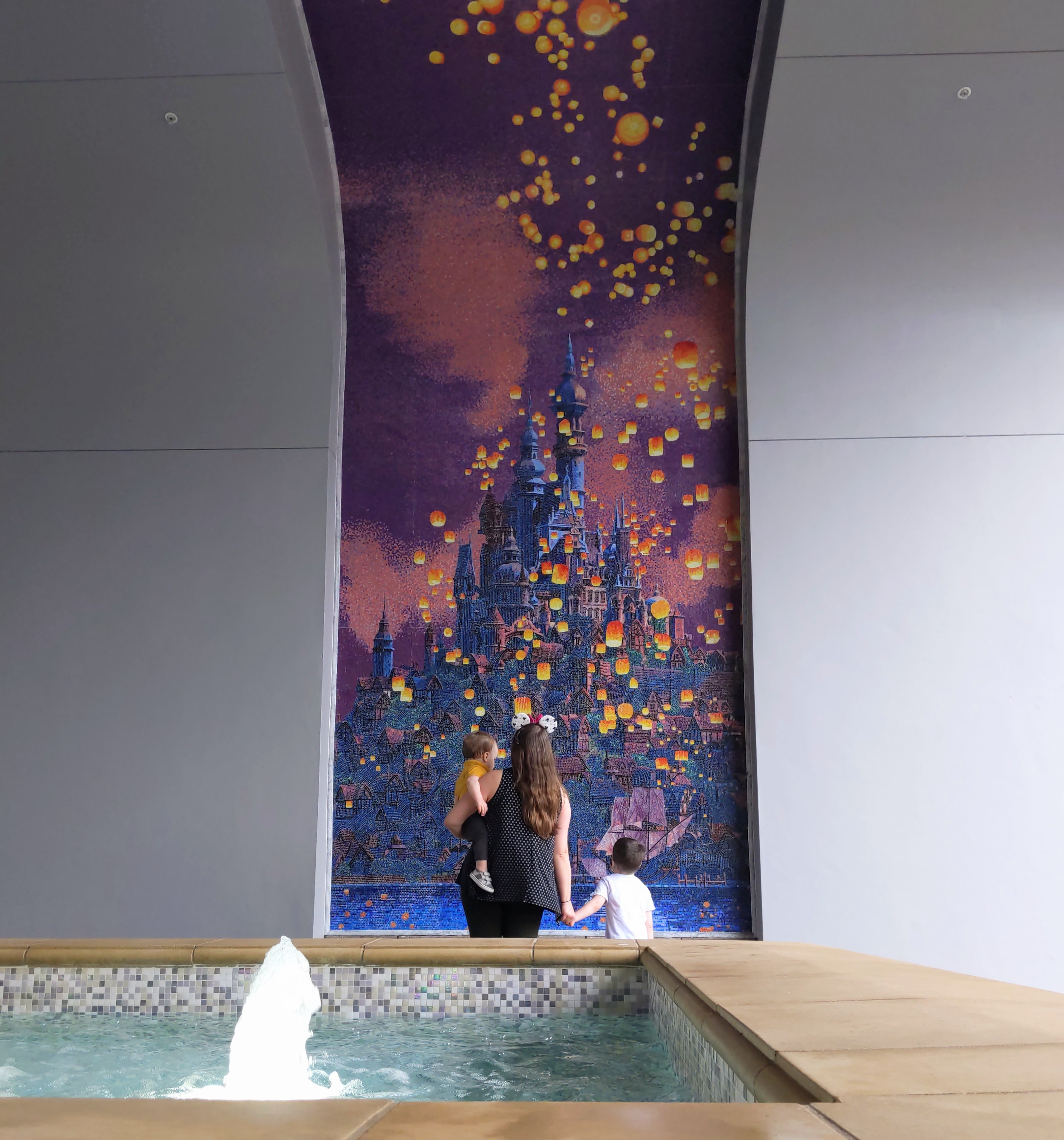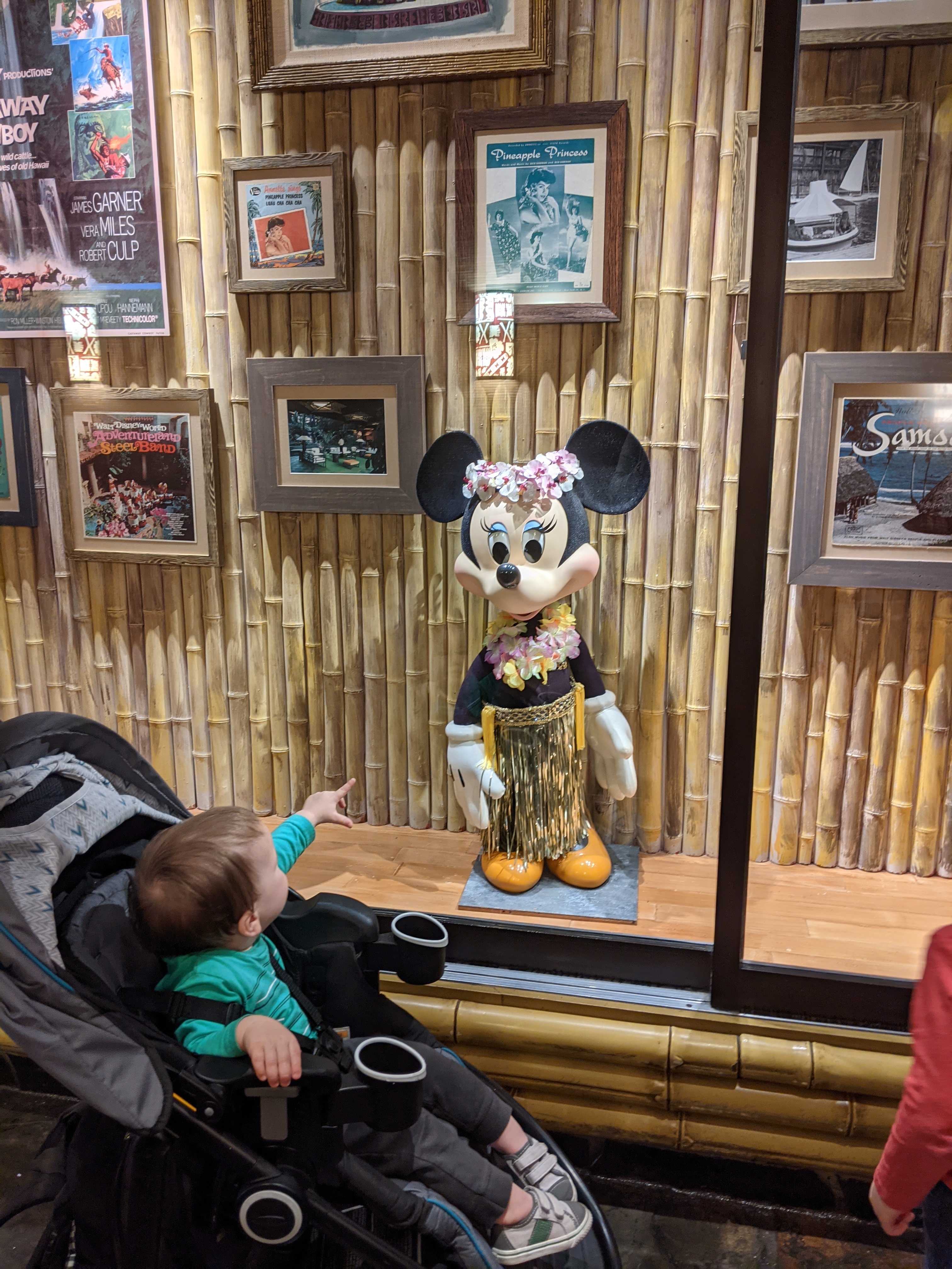 We were back at Poly to get dole whip again today and had no trouble. Walked over to GF and wandered around a bit but it was very windy so we didn’t see the whole grounds. Loved the Mrs Potts & Chip and Peter Pan designs in the tile downstairs and got a peek in Enchanted Rose. It’s stunning and I think it fits in with the GF decor really well, even if B&TB isn’t necessarily a fit. We also saw the carousel horses and penguin fountain in the DVC lobby and DS4 loved those. We tried to take a self timer photo (phone in the stroller cup holder) on our way out, but it was very gusty and I would have liked a 2nd try to change the composition a bit. But you get what you get with a toddler and a baby.
