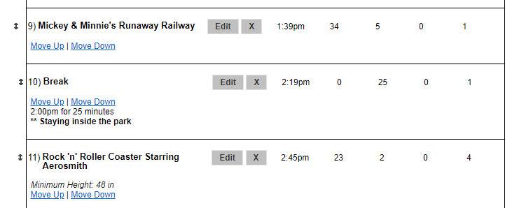Right, we tried this for one of the coasters at DHS and it must have calculated our break right at the gate, since the first step in the plan is “Arrival”. Then it added in a 15 minute walk.