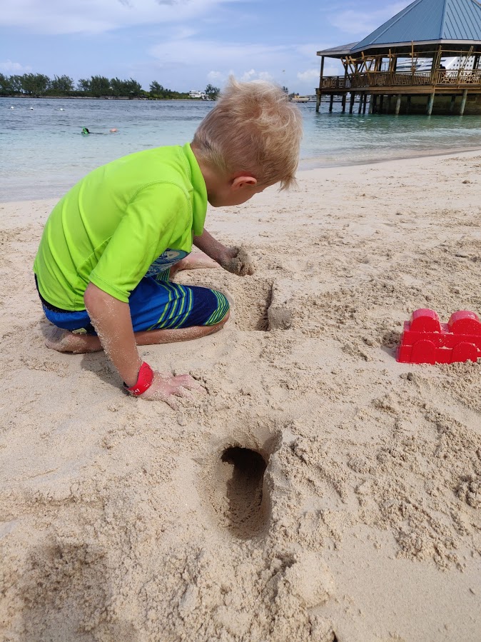 Then I realize that I forgot the sandcastle stuff, so I walk all the way back to the stateroom to get it, then walk back off the ship and make the 7-minute walk to the beach area and then walk up and down the beach until I locate my family. (Not having cell service makes it much harder to find people once you’ve separated!)