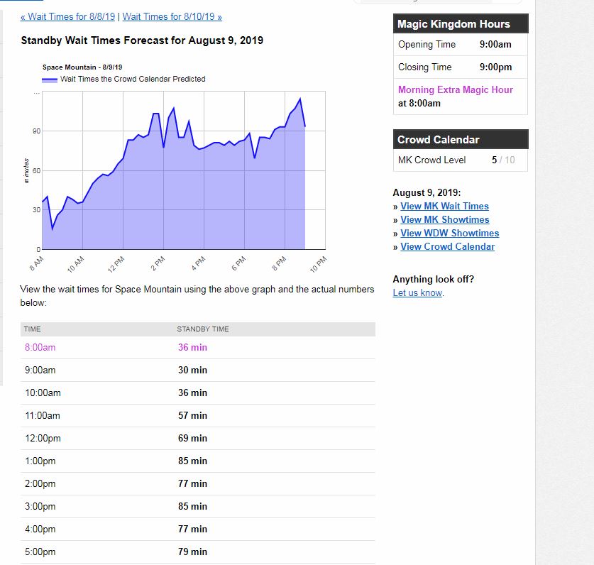 TP’s Space Mountain Standby Wait Forecast shows that the wait on 8/16/2019 will start at 50 minutes at 8 am, then drop to 20 minutes at 8:30 am. This is very different from the steady increase on 8/15 and 8/17.