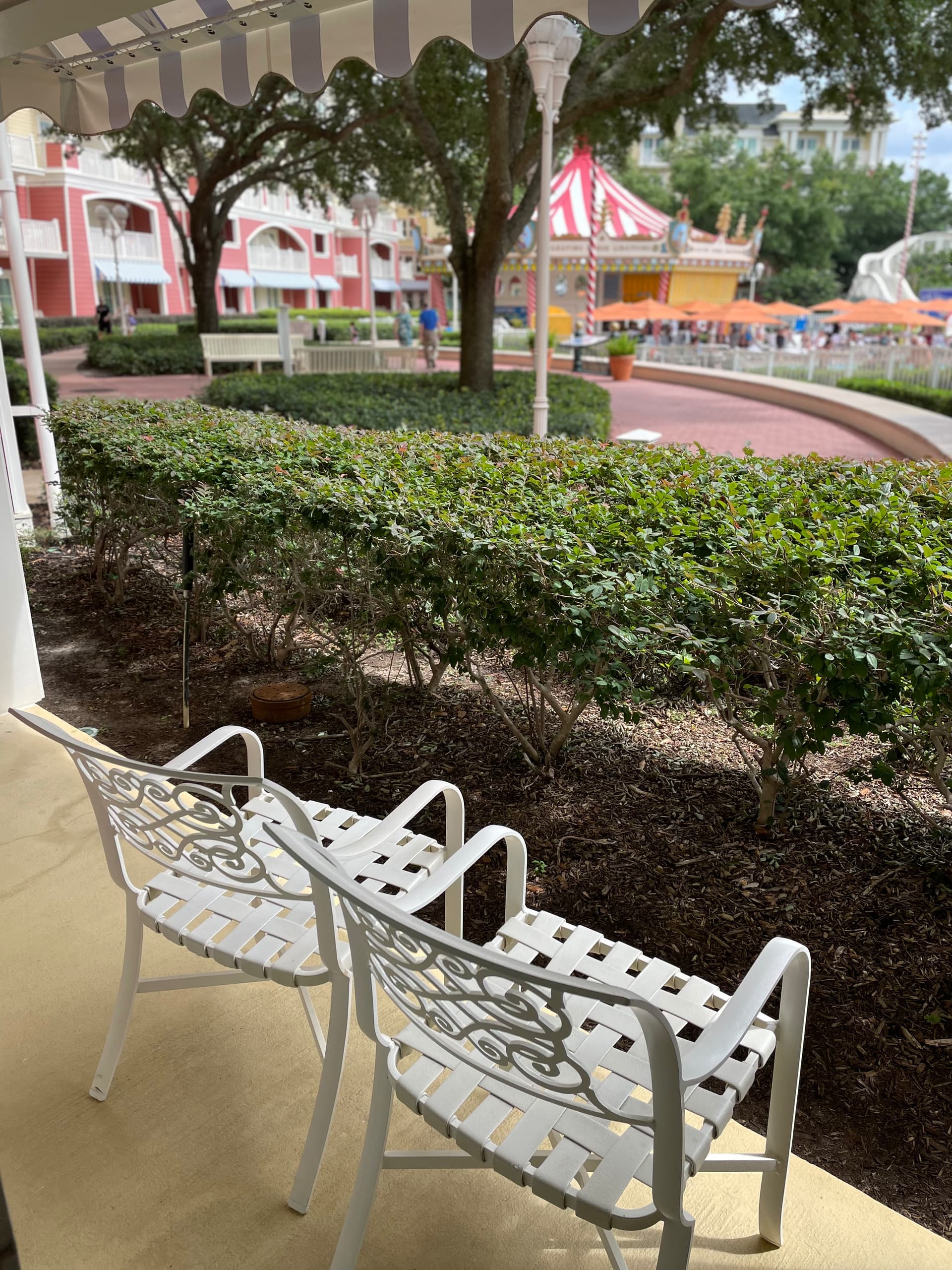 There was dividers and bushes to block in the patio. This was an amazing location ( around the corner from the fitness center BUT it is a wheelchair accessible room and the bathroom area could only be used by one adult at a time (I was traveling with my sister). The shower was hand held. There are showers very close by in the fitness center.
