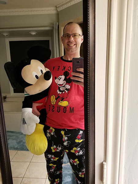 Hello, my name is Paul, and I am an addict. A Disney Addict. I’m a 33 year old man and I’m not ashamed to say that my favorite movie is Beauty and the Beast. My radio almost exclusively sings Disney, and I wear Mickey Mouse pajamas to bed (see proof below). I grew up during the Disney Renaissance and the stories and music became a part of me. Despite this, I first considered a trip to Walt Disney World (WDW) less than a year ago*. The idea started like a dim candle at the end of a long dark hallway, but a moment later the house was on fire. Visions of WDW engulfed me like an inferno. Why had I never thought of this before?!?!