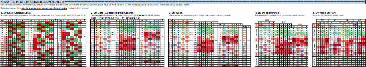After all the data was compiled and organized, I copied it onto a single “calendar” and transposed everything so the calendar reads horizontally instead of vertically. The equivalent 2019 dates are shown in the very middle row, and moving up (TP) and down (KtP) are 2016-2018 average crowd levels (overall and park-specific).