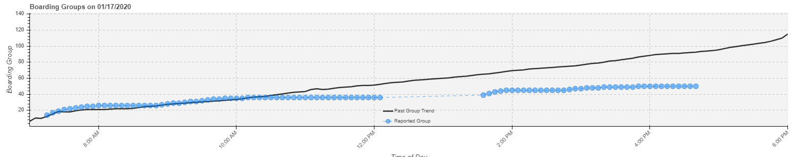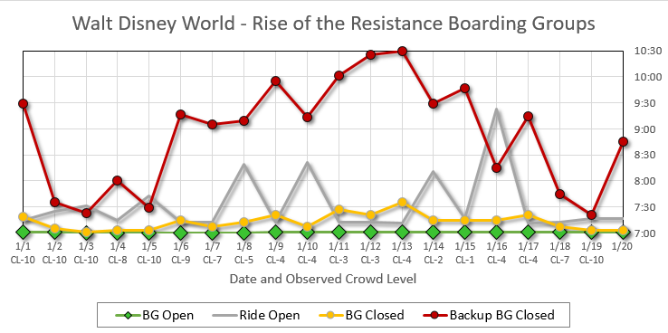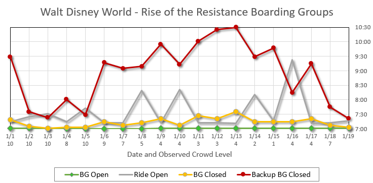 I added the Crowd Level to the horizontal axes and removed the park opening. Now park opening and Boarding Groups starting and basically the same thing now.