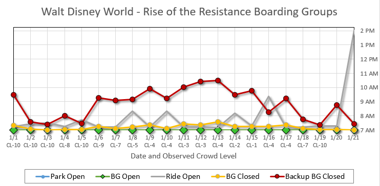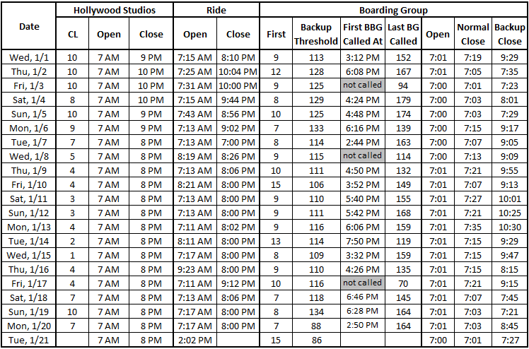 1/20 shows that an early threshold for Backup Boarding Groups did not foreshadow less Boarding Groups being called. They got to boarding group 164. A late opening is not a good sign for today. I don’t know if either is a sign of the rest of the week.