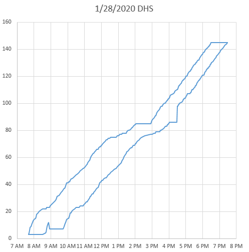 We were in line during this time Jan 28 (BG 84). We stopped and did not move from 2 pm to 2:50pm. CMs handing out water, chips and bananas . Were off the ride at 3:10.