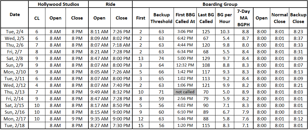 Today RotR had a good day. All BG and BBG were honored by 7:30. First day in the past 6 days where the rate of Boarding Groups per hour is higher than the 7-day moving average.