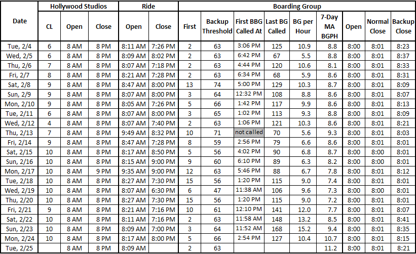 In January, I didn’t quite know what I was doing and got lucky to get boarding group 76 with my daughter (and that wasn’t a BBG at the time). This time I had read up on the process and practiced at home thanks to the suggestions here. I was in the park Thursday 2/20 and Friday 2/20. I was on Wi-Fi inside or close to Legends of Hollywood store (there were two of us and we were not in a crowd trying to get on another ride). I got BG 18 on Thursday and BG 16 Friday!