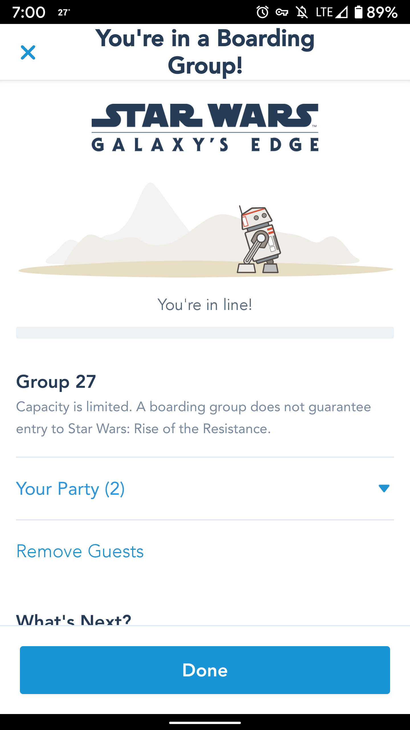Weird thing happened this morning. I was practicing getting a boarding group from home. But instead of getting the “is everyone in the park” message, I got an actual boarding group. I cancelled of course, but this is one more glitch to add to the list of the inadequacies of the BG process.