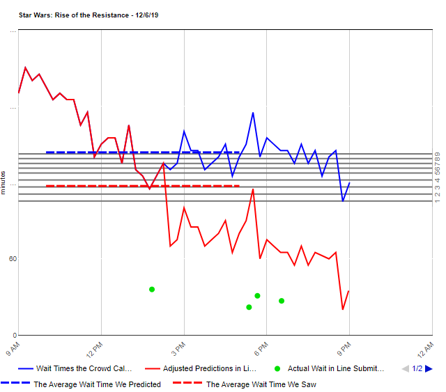 Speaking of TP data analysis, this is their chart of wait times from yesterday. For a typical attraction, this would show downtime and posted wait times. Unfortunately, the only data they appear to have is their forecast and wait times submitted by Liners (green dots). Wait times right now mean the time they scan in for their boarding group until they board a vehicle - so it doesnât factor in when they got a BG or whether they were evacuated, etc. So not too useful.
