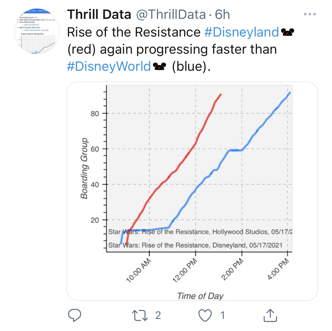 Disneyland RotR is doing pretty good. It had called more BGs than WDW at 4pm west coast time despite being 3 hours behind.