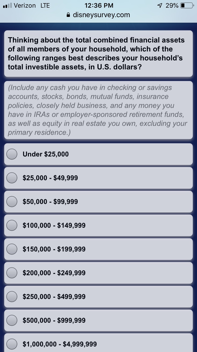 Usually Disney has asked me about my annual income. I know Len and Jim Hill said they thought this question was to see if there was a loyal base for “boutique cruises” (is that the phrase?). Other surveys I have taken always ask for me to not count the equity I have in homes. This, to me, is the “how much are you really worth question “.