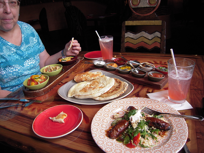 Day 5, the very first time we ever visited WDW without spending a day in some park. Like I said earlier, we intended to see areas of Disney never visited before. We took the opportunity to walk thru nearby Yacht Club and Boardwalk Resorts. I really liked the Yacht Club. Much more aesthetically appealing and acoustically quieter (more carpet and wood flooring) than the Beach Club. Then it was off to Kidani Village for lunch at the Sanaa restaurant. The African setting and wildlife view was gorgeous. Nor did the Sanaa restaurant disappoint. All my wife and I ordered for lunch were appetizers: spiced naan bread, a salad sampler and lamb skewers. We left stuffed, and the food was sooo good. Add in gazelles, zebras, giraffes, kudu, and ostriches walking outside the restaurant windows as we ate … memories for a life time! Then it was off to Disney Springs. My wife wanted to eat at one of her favorite Iron Chef restaurants, Masaharu Morimoto’s Morimoto Asia. Again, a truly wonderful dining experience. The food was every bit as good as any other high-end Disney restaurant, but a little less expensive