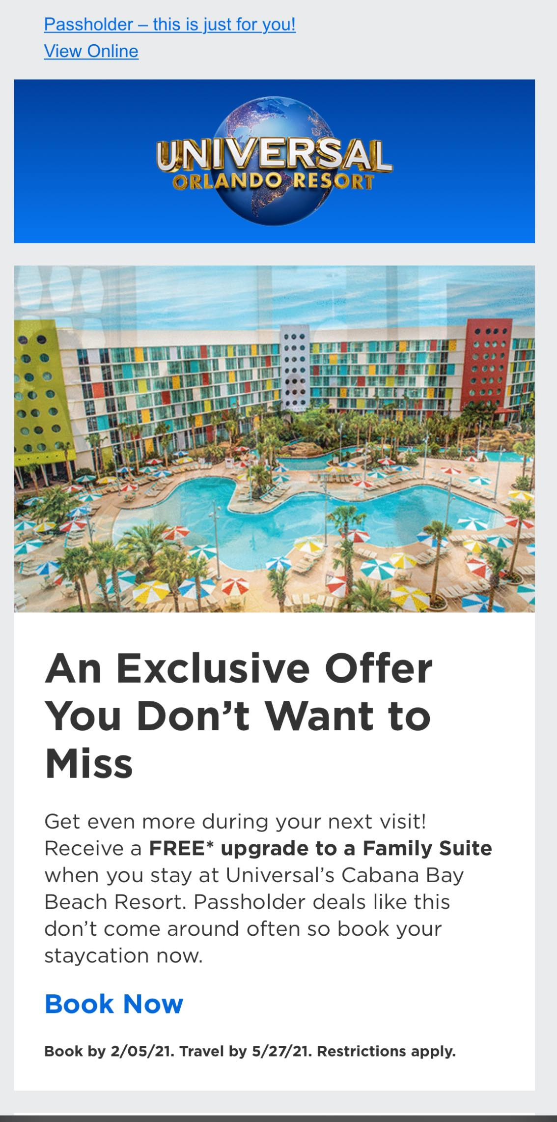 Note, even with the email, I still had a hard time booking it. I asked my TA to get the upgrade for me. The CM she talked to said that there was no such deal and that rack rate for my dates was the best. I thought about it a bit, and decided to call myself starting the conversation with “Do you know about the free upgrade to a suite at Cabana Bay” He did. So I went ahead and made a new reservation. Then I thought about and decided for 104, I’d get a second room. That person I talked to said that there was no such thing. and that passholder rates weren’t out yet. So, I called back and talked to a different person who hadn’t heard of it but was willing to do some work and I got a second room. Note it might also be limited by location since they asked what state I lived.