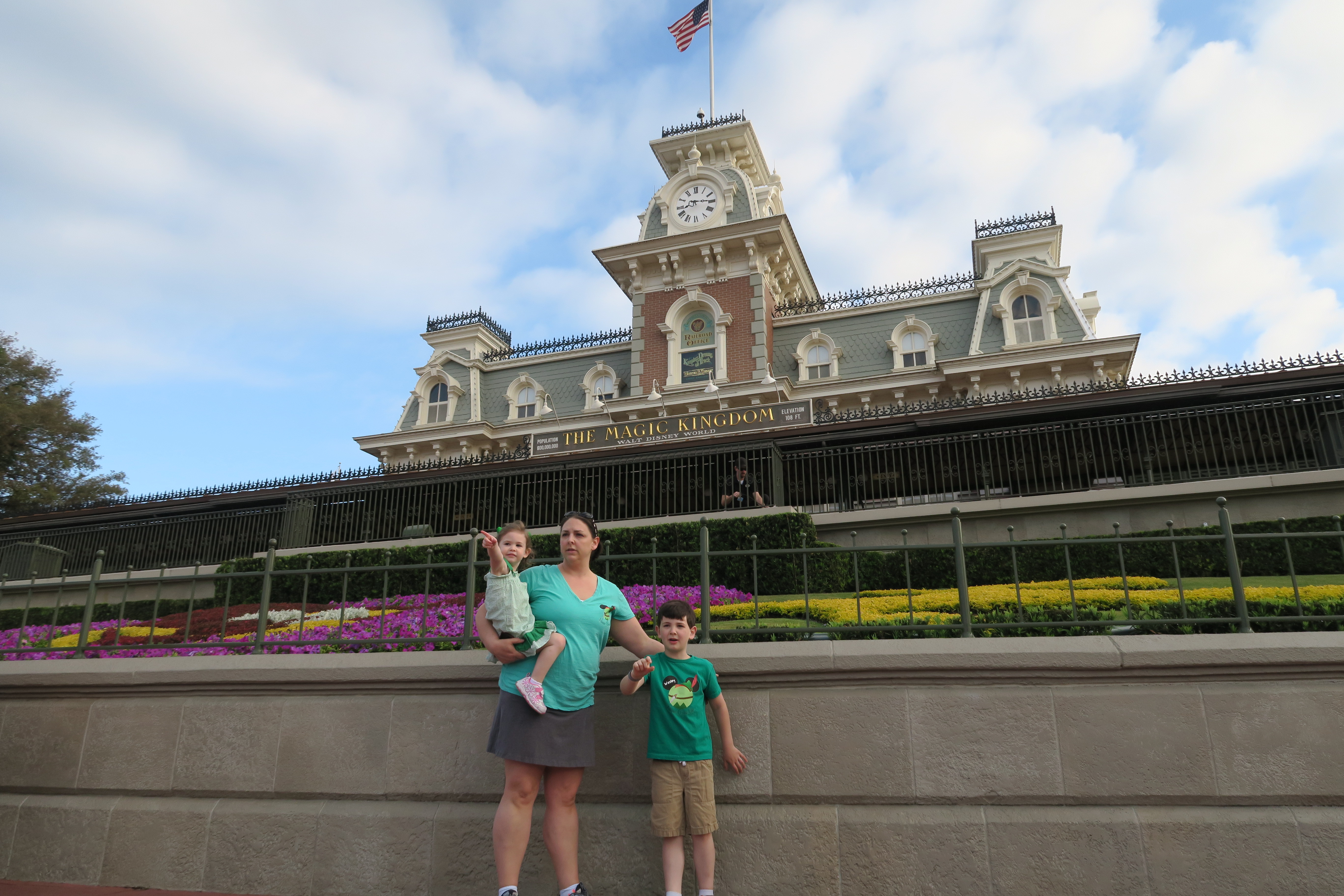 We got ready and loaded up the car. Yes – we drove to the parks. I’m not a fan of busses. Not that I’ve ever used them with regularity, I just like having a car and it’s so much easier to be able to load up three kids and all their stuff. DH needed coffee so we stopped at the McDonalds on property (whoa!! That place is way more expensive than real life McDonalds) and ate in the car on the way to MK. We got to MK parking around 7:50. We sat in the car and ate our biscuits and let the kids watch a bit more of whateve DVD was on in the car to kill some time. Then we headed over. We were too early for the Monorail so took the ferry over. We arrived about 10 minutes later, passed through bag check with no problems and waited for the Welcome Show. I’ve always wanted to see it but never was able to get the family out early enough. But this time I did it! We were early, probably earlier than we needed to be – I had some vague hope of being the family of the day. I won’t lie - I knew it was an extremely long shot but the thought crossed my mind. But I got to see the Welcome Show and it was magical and I may have had some pixie dust in my eyes for a bit.