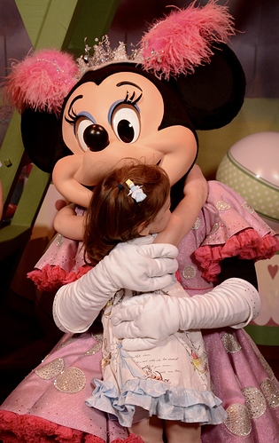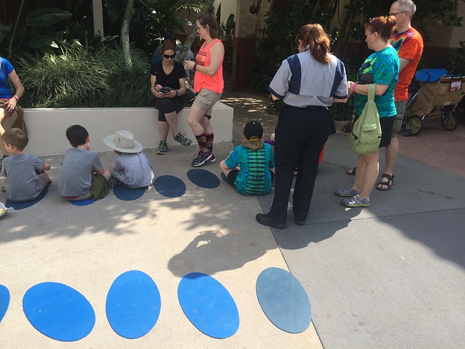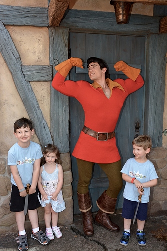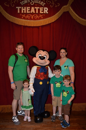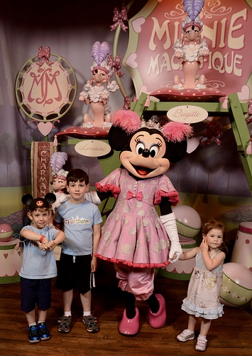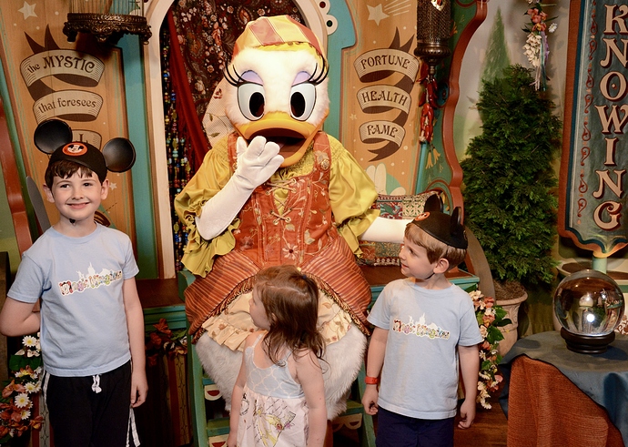 Went first to meet talking Mickey. Oliver, my middle child, had requested to meet him first thing. I had to change the TPs around to get it done, but of course, that’s what we did. Waited like 5 minutes. In hindsight I should have probably warned the kids Mickey would be talking. They aren’t used to talking characters. But they were fine by the time it was our turn. I had made the kids pillowcases to get autorgraphs this trip (previous trips were a picture frame mat and individual character cards I then put in our scrapbook). They like having something to hand the characters, it breaks the ice and gets the interaction started. So they each handed Mickey their pillowcases in turn and then we played for a minute with Mickey, acting like we were lions and roaring at the camera. LOL. It was cute. And the pictures are adorable.