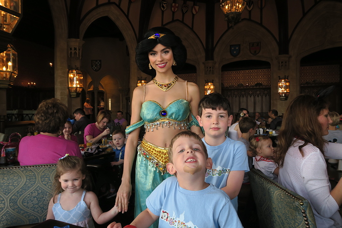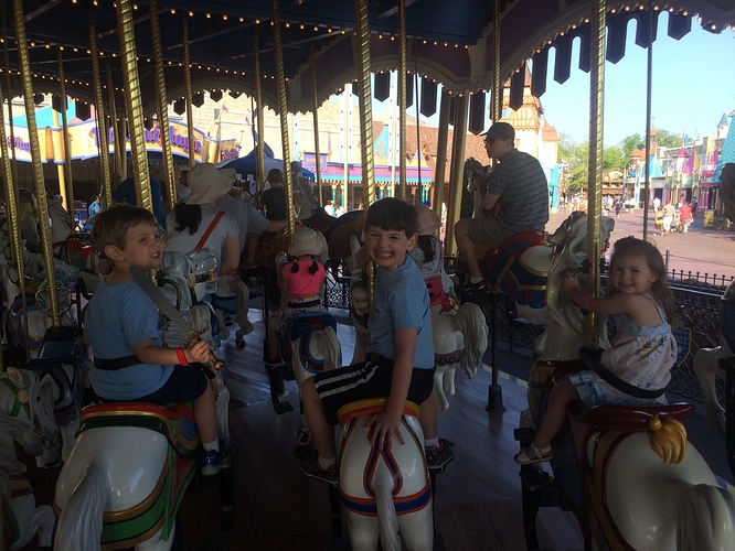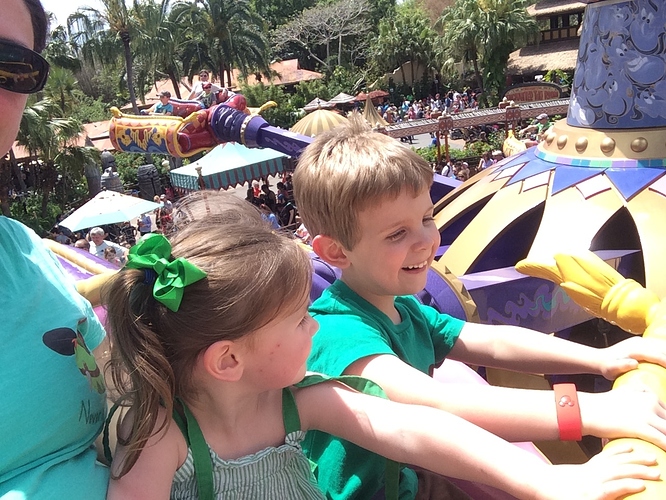 Then on to meet Aladdin and Jasmine. We waited a long time for this one because we were the last people in line as the CM there cut the line. I hadn’t planned on a 45 minute meet n greet but that’s what we did becuase the kids said that’s what they wanted to do right then. So I guess this did DH in because he decided that he had to go back to the hotel after this. And he took Wesley with him. So my plan ended mostly. DH leaving put a damper on the rest of us. I got kind of mad at him for this. But I had 2 kids still with me and we went on to ride Magic Carpets. That was fun – Oliver and Ady really enjoyed it and we had a fastpass so no wait. Yipee!
