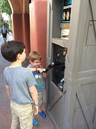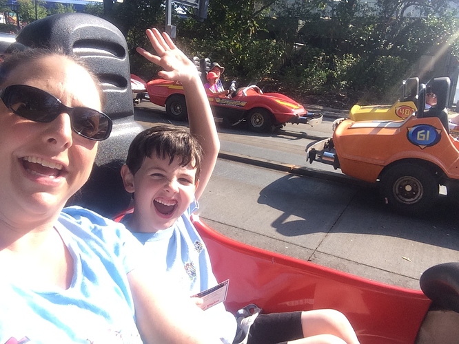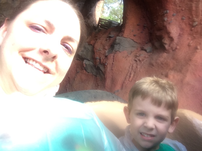 DD and I played at the Laughing Place (is that the name of it?) under Splash while waiting and we got our first pressed pennies there too. I had planned for DH to ride Splash with the boys next but he insisted I ride with Oliver (the 4yo) instead. So Oliver and I went to get in line. I pulled out ponchos on the way – and I have to say I’m glad I did. We were in the fist row and would have gotten soaked without them.