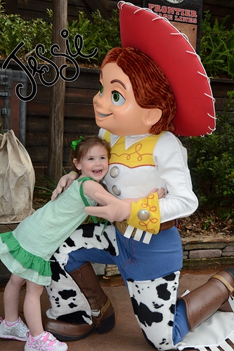 After Splash, we got in line to meet Jesse and Woody, waited maybe 10 minutes but probably less, they had just showed up for their meet when we got in line. My kids love Toy Story (ok I love Toy Story!) so they were excited to meet Jesse – we’ve met Woody and Buzz and they’re always favorites, but Jesse was new to them this trip. It was a fun interaction. Jesse loved DD’s hair ribbons and showed DD her yellow ribbon. It was cute.