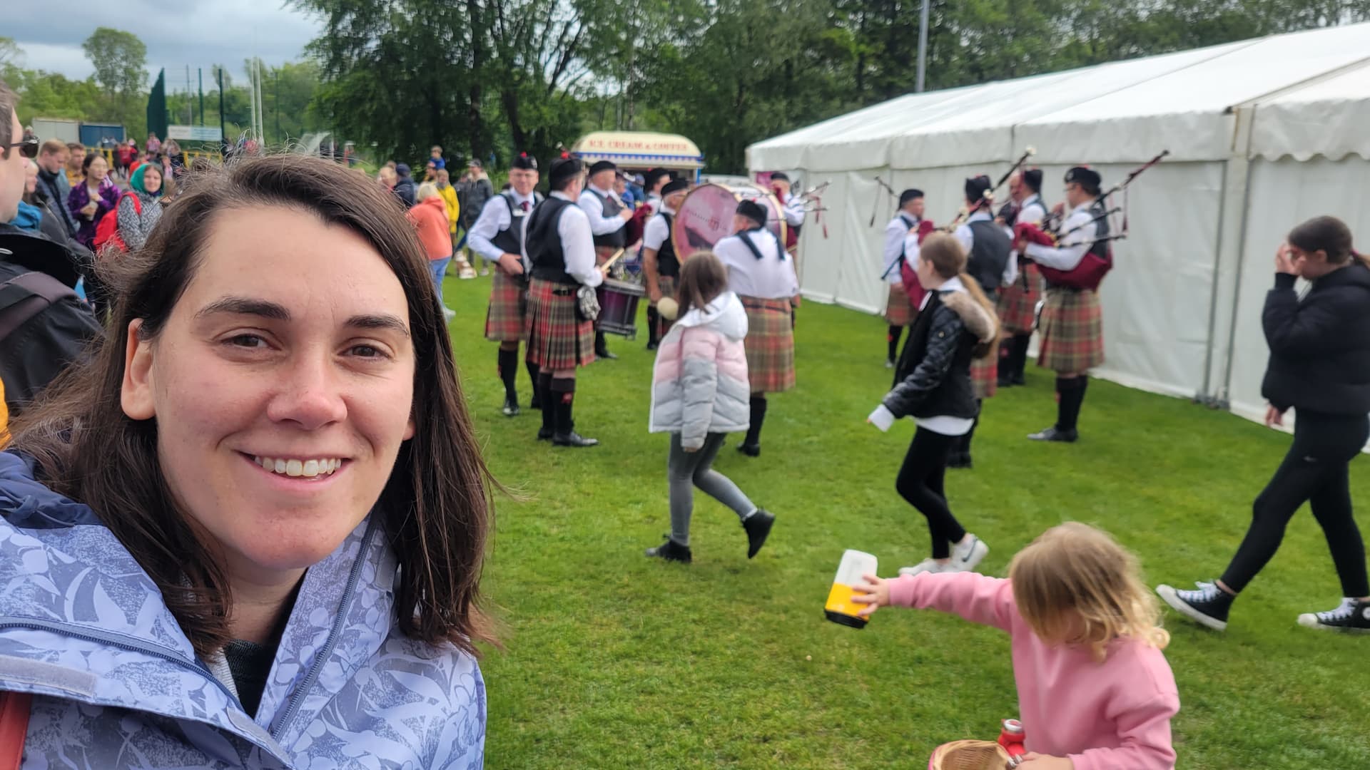 We went to the Bearsden & Milngavie Highland Games and they were very cool. It felt very local but we got to see some of the games (mostly haggis tossing), some dogs, music and some snacks. I had a bacon roll and some shortbread. Kids got “candy floss”!