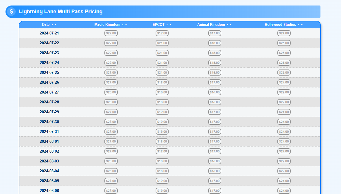Is there a way to check how much LLMP and LLSP cost for a particular day for a particular park?