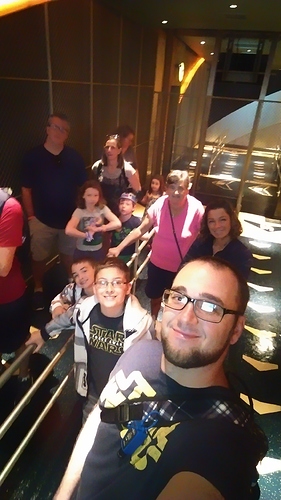 Wednesday night was going to be Star Wars night at DHS for us. I had planned on just going there and doing any and everything Star Wars that they wanted before the Fireworks show. Well, we ended up with a little more time there because we cleared out Epcot sooner than expected and even after the break at the hotel, we got there early. That meant we added Indiana Jones, an Olaf M&G, and a ride on Great Movie ride into the plan. We were not a fan at all of GMR by the way, but this trip was a lot about doing things we hadn’t done before, so we had to try it. We still managed to get in our Star Wars stuff. Backtrack a little to when we arrived at the park right as Captain Phasma was leading the march by the entrance. We made our stop in the Launch Bay to meet Chewy and see all of the artifacts. Kylo Ren was waiting until the next time we came to DHS and we would use the Visa M&G for that, we didn’t catch him before the Visa meet was done for the day this time. We had a really good spot, dead center right up at the stage in front of the Chinese Theater, for the Galactic Spectacular Fireworks show and I was just amazed. It’s not even fair to call that a fireworks show, because it is so much more. The bad news with our good spot was that it meant we were near the back of the line to get out of the park and this gave us our longest wait for a bus of the whole trip, but it was worth it.
