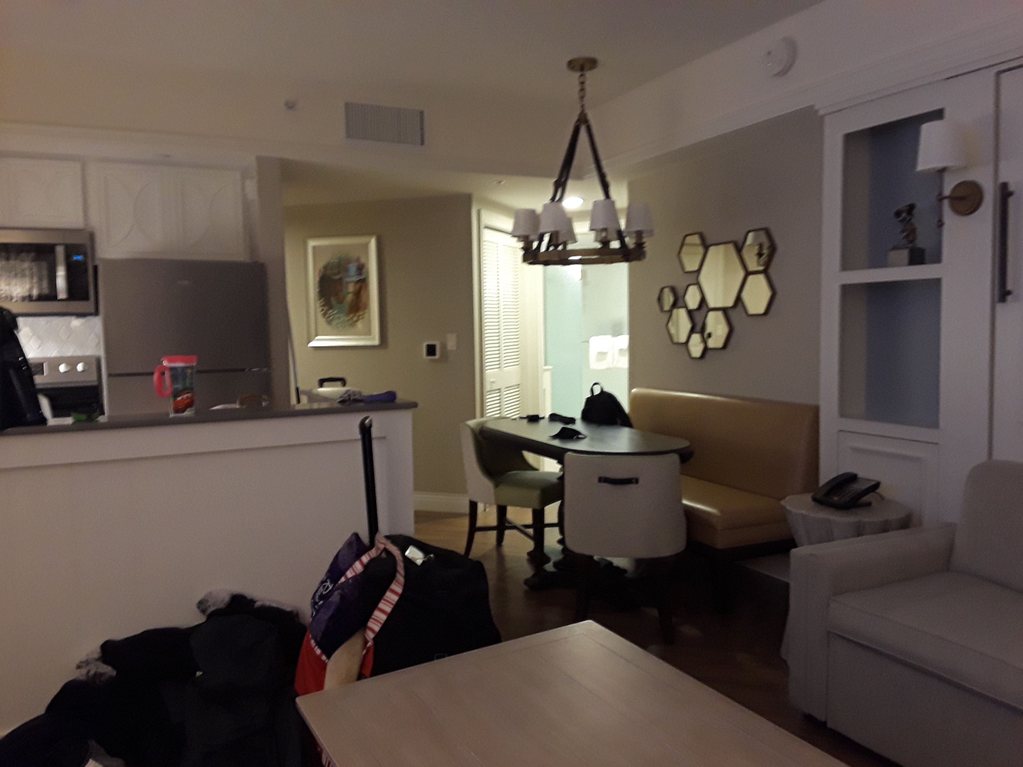 Check in: our villas are in 2 different buildings, in 2 different areas of the resort. Duh, new reservation. At check in we’re quickly handed off to Matthew, a manager type person who has a wonderful mask, very second star to the right but for CMs only. We’ve asked Matthew can we down grade one of the 1 br to a studio and have connecting units. He says, I’ll check availability. Amazingly, we wind up with a dedicated 2 br villa in the Springs area. The remodeled unit is so cool! Our previous 2 br, 5 years ago, was a bit tired looking. Thank you, dear Matthew.