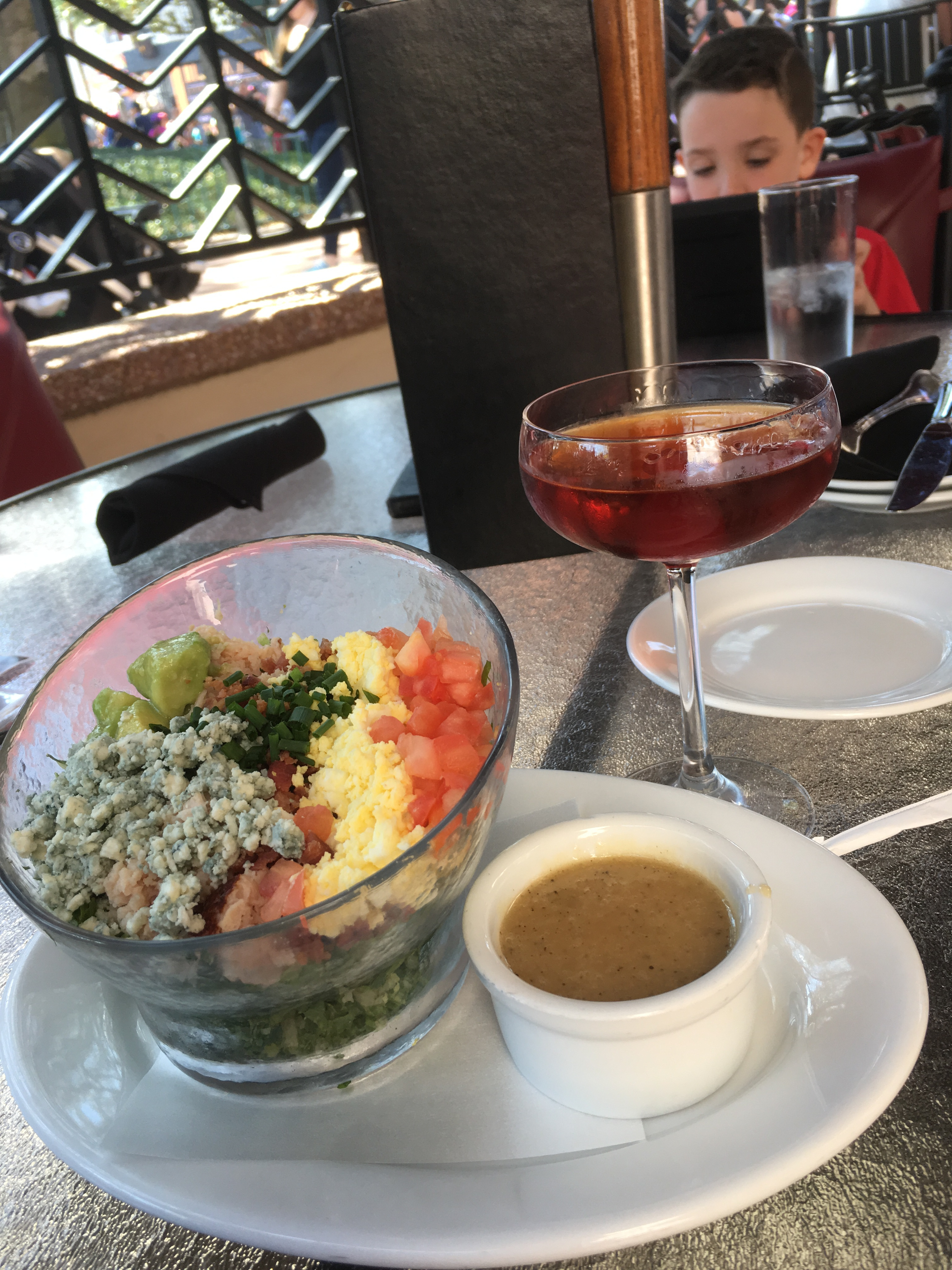 Afterwards it was 11:50. We weren’t really into the expense of the full HBD experience, so I was really hoping to grab a seat at the HBD Lounge right when it opened at 12. This proved easy - we were there 5 minutes early and grabbed a seat with no trouble. It was a beautiful afternoon and patio dining was extremely pleasant, though I will say the neighboring SW: AGFFA show was very loud. I broke with longstanding tradition and precedent as the beer guy and in deference to the setting ordered a Manhattan, while my wife had a martini. These were good drinks, well made, not like some other park mixed drinks can get. I had the Cobb salad, my wife had the Andouille-crusted shrimp, and from the dessert trio we chose the double vanilla bean creme brulee, the amaretto flan, and the grapefruit cake (natch), which my wife paired with the grapefruit martini. I actually liked the flan the best, followed by the creme brulee. The grapefruit cake was good but just slightly outshone by the other desserts. Overall a very good meal, with excellent service - one of the highlights of the trip.