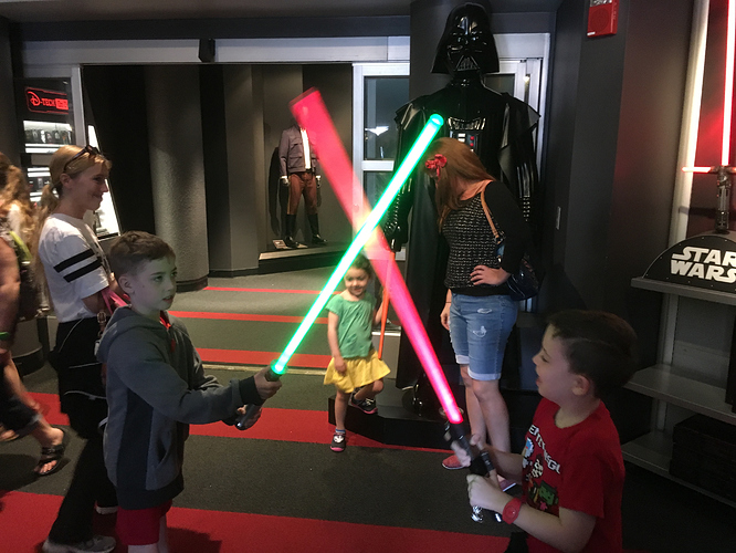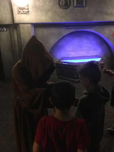 So after TSMM we went right to SW:LB. We watched the movie, but if you weren’t into that, you could have just walked right into the museum portion. The kids enjoyed seeing the speeder, the bar with the blue milk, and the Jawas. They traded the Jawas (they had picked out their trinkets months in advance), didn’t like what they got the first time, so re-traded again. We then got into the Kylo Ren line, the 6 yr old asked him “Are you going to find Rey and fight her again?” to which Kylo responded, “indeed!”. Pretty good Adam Driver voice, is that a recording?