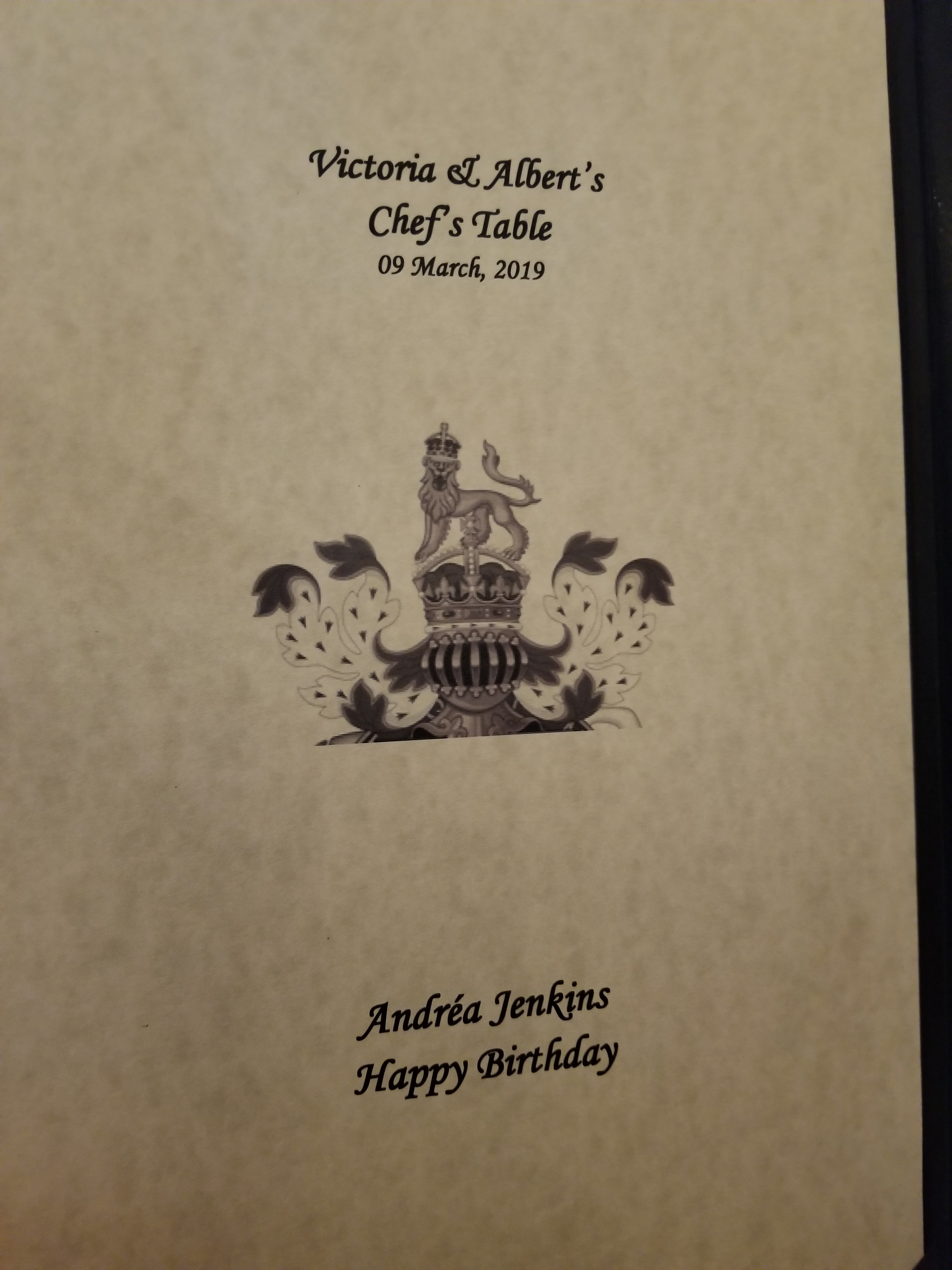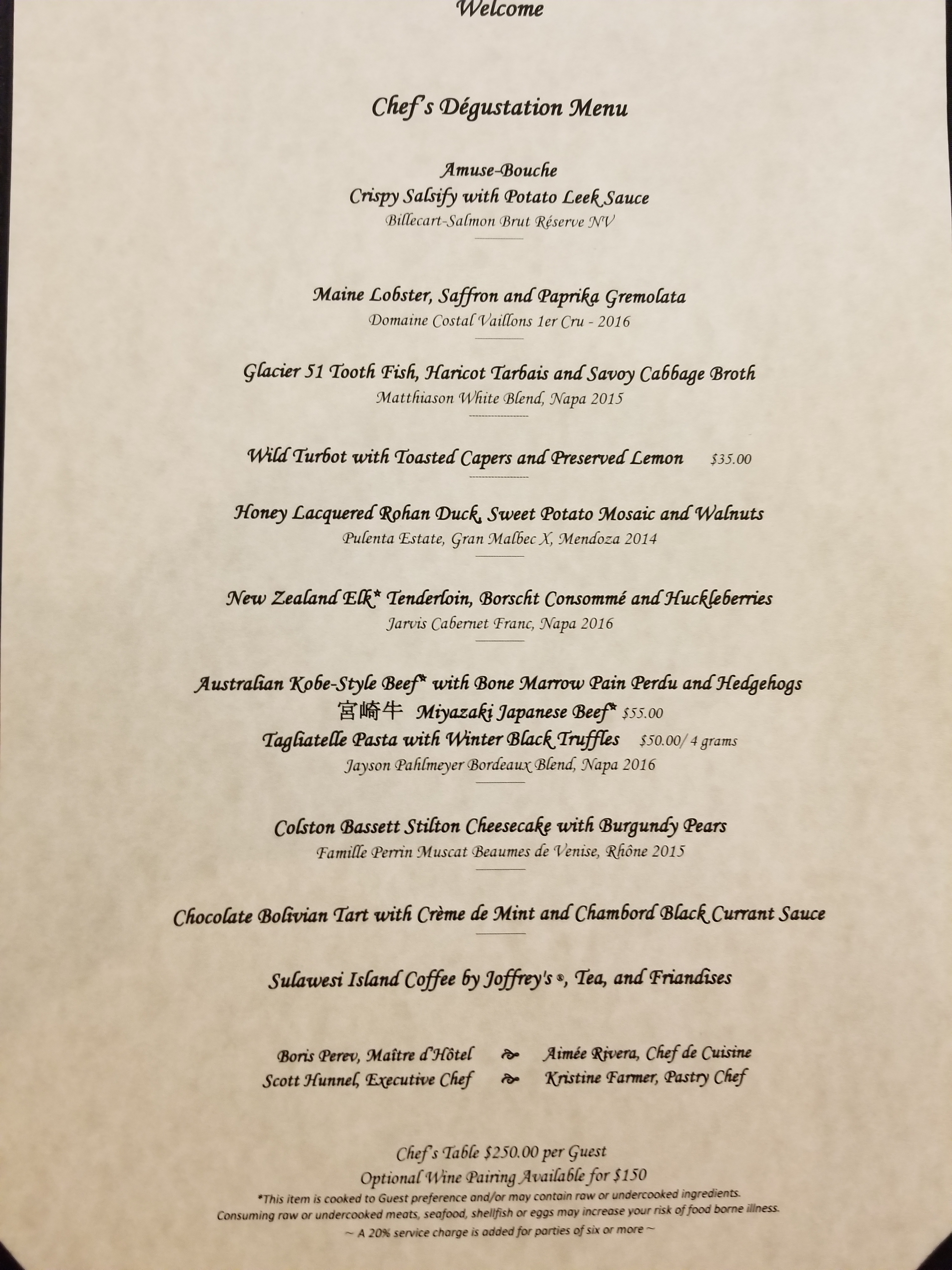 While Andrea was talking a shower, I called the spas and was able to get Andrea an appointment to get here hair washed, died and styled for 2pm but that would mean no nape before the 530pm reservation at V&A. She used a Lyft to get there and loved who they took care of her. I took a shower and got ready and took a Lyft there. We walked around GF and took it in. Oh, I also had to buy a Monster Energy drink before we went upstairs. We both were tired as by this time it has been. Finally we went upstairs about 5:10pm and ended up relaxing right outside at the tables and chairs. Lana from V&A came out, verified some information adn let us know what was going on. At 5:30pm, she came back out and we were led inside. This is where I will stop for right now, as I am tired, however I am including some pictures, which include the menu that we were presented at V&A Chef’s Table.