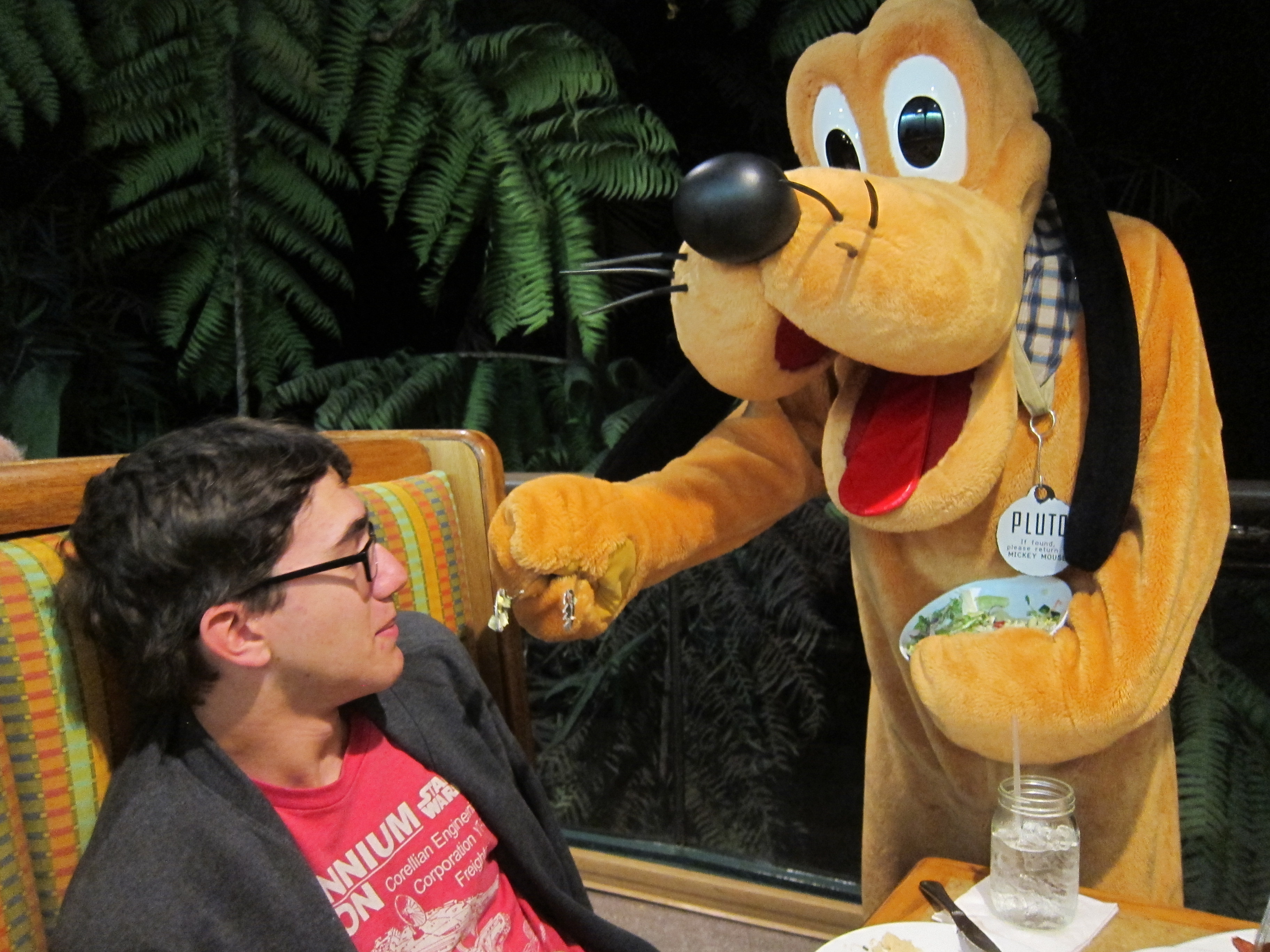 So we made it a little competition. The boys asked a friendly Cast Member the fastest way to DS since the bus to DS wasn’t running yet. They went to a close resort – AoA or Pop. maybe? – and then on to DS. The girls went back to the CBR, grabbed some jackets, and waited for the bus to DS. And waited. And waited. The girls obviously did not win, but we were all checked in to the Rainforest Café by 4:10 so it all worked out.