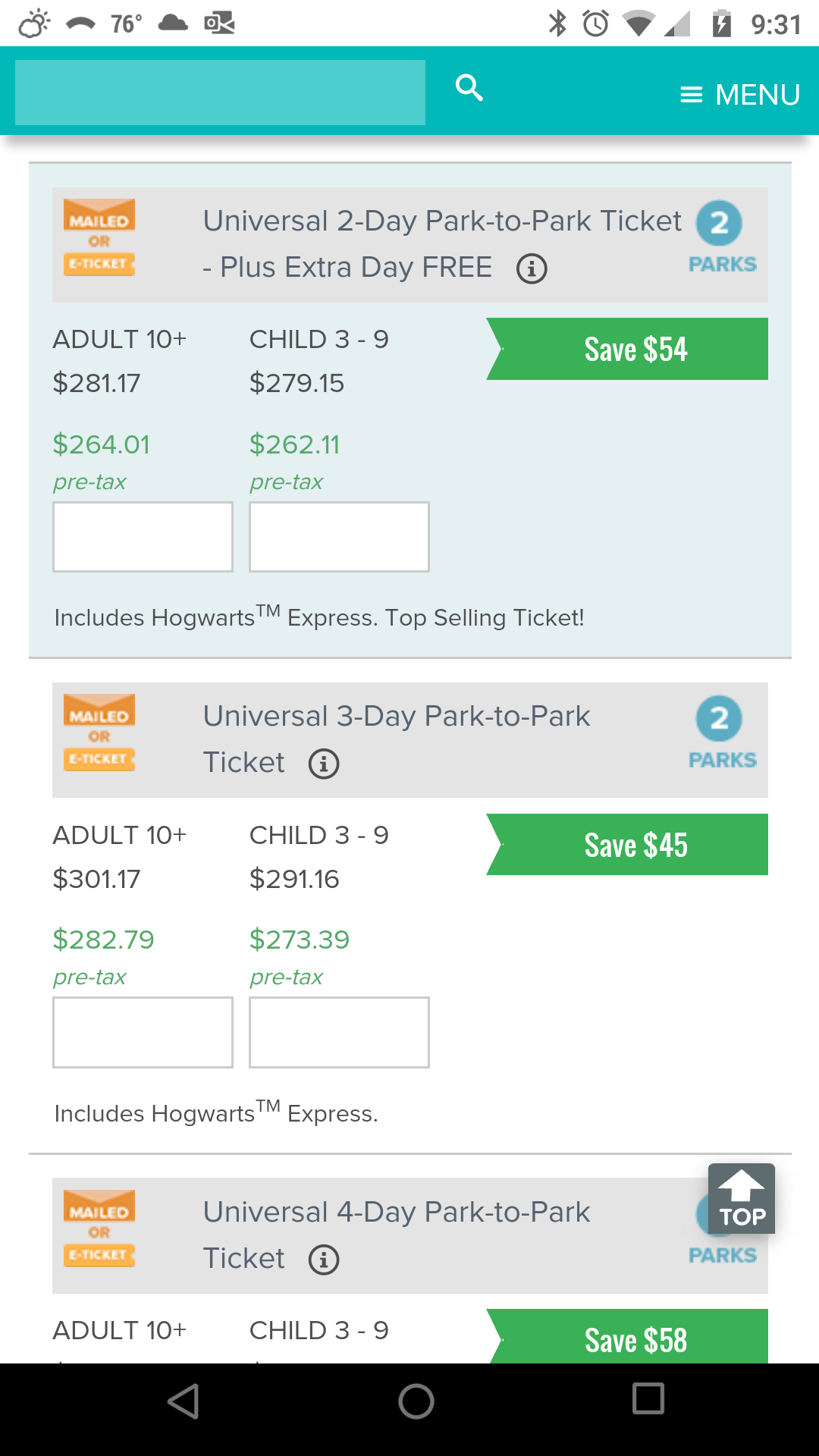 On March 12, I purchased a 2 park buy 2 days get 1 extra day park to park ticket from Undercover Tourist for $280.17 by using a mousesavers link (current cost on the UT website is $281.17). The top one in the following screen shot.
