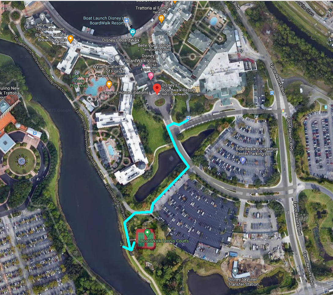 I was just reviewing @len account of using the two-bus approach to get to HS early (bus to AK, then to Boardwalk). This might be appealing for our group of 7 since Lyft/Uber is going to require finding not just one but two rideshares in those busy rope drop hours. Also since we are as ASMo we will be fairly close to AK. What is the most direct path from the Boardwalk bus stop to the path to HS? Via the tennis courts, or is there a sidewalk along the southern wing of the building that connects to the path? Also just to confirm are there always buses back to the resorts even before AK opens?
