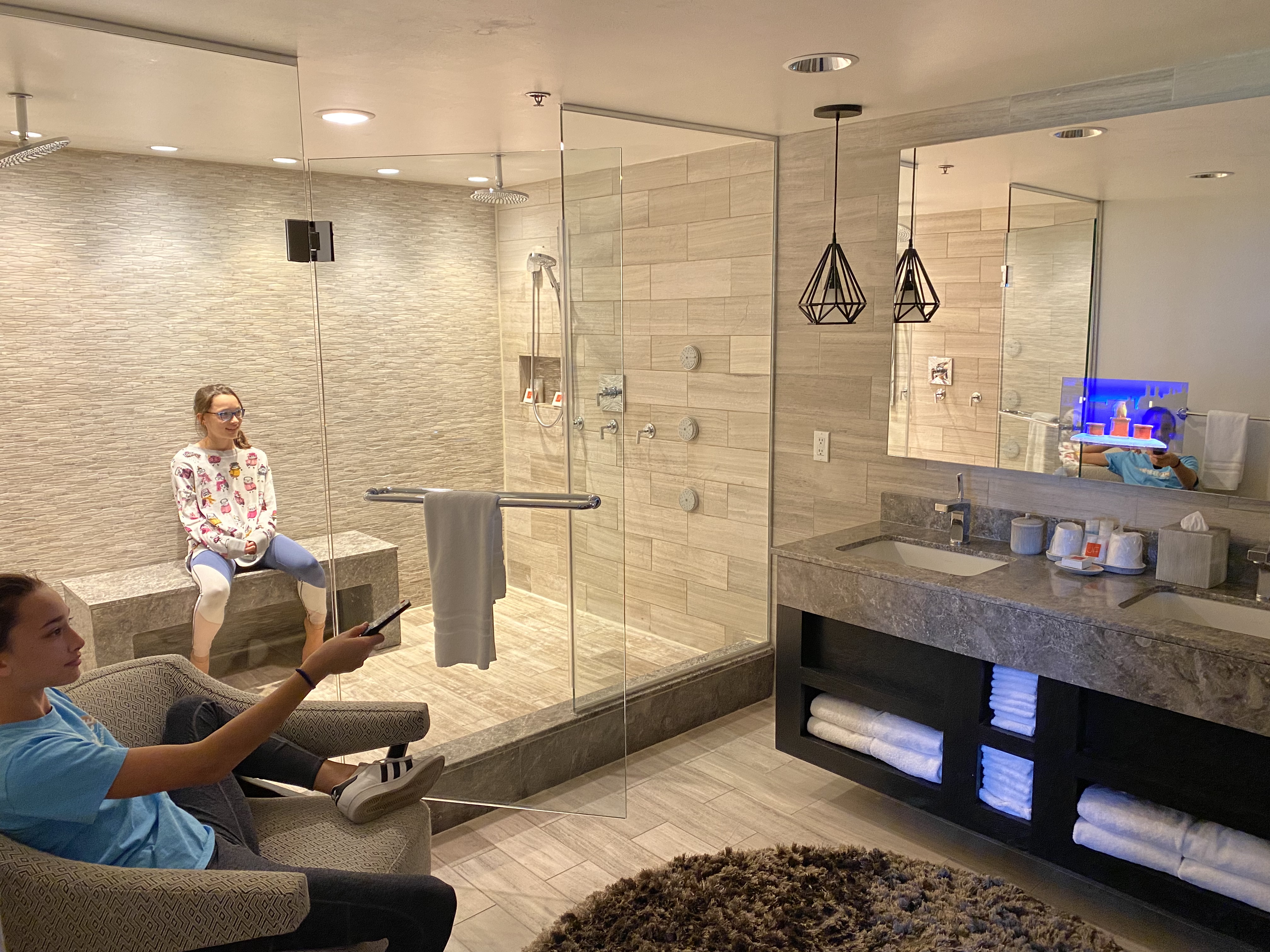 Yes it’s insane. That bathroom is bigger than apartments I’ve seen. I told DH that bathroom makes me want to build a house (something I swore I’d never do) just to put that bathroom in it. DH and I took super long showers and feel like new humans. Girls are in there now having a blast (this should be an attraction listed on the resort map