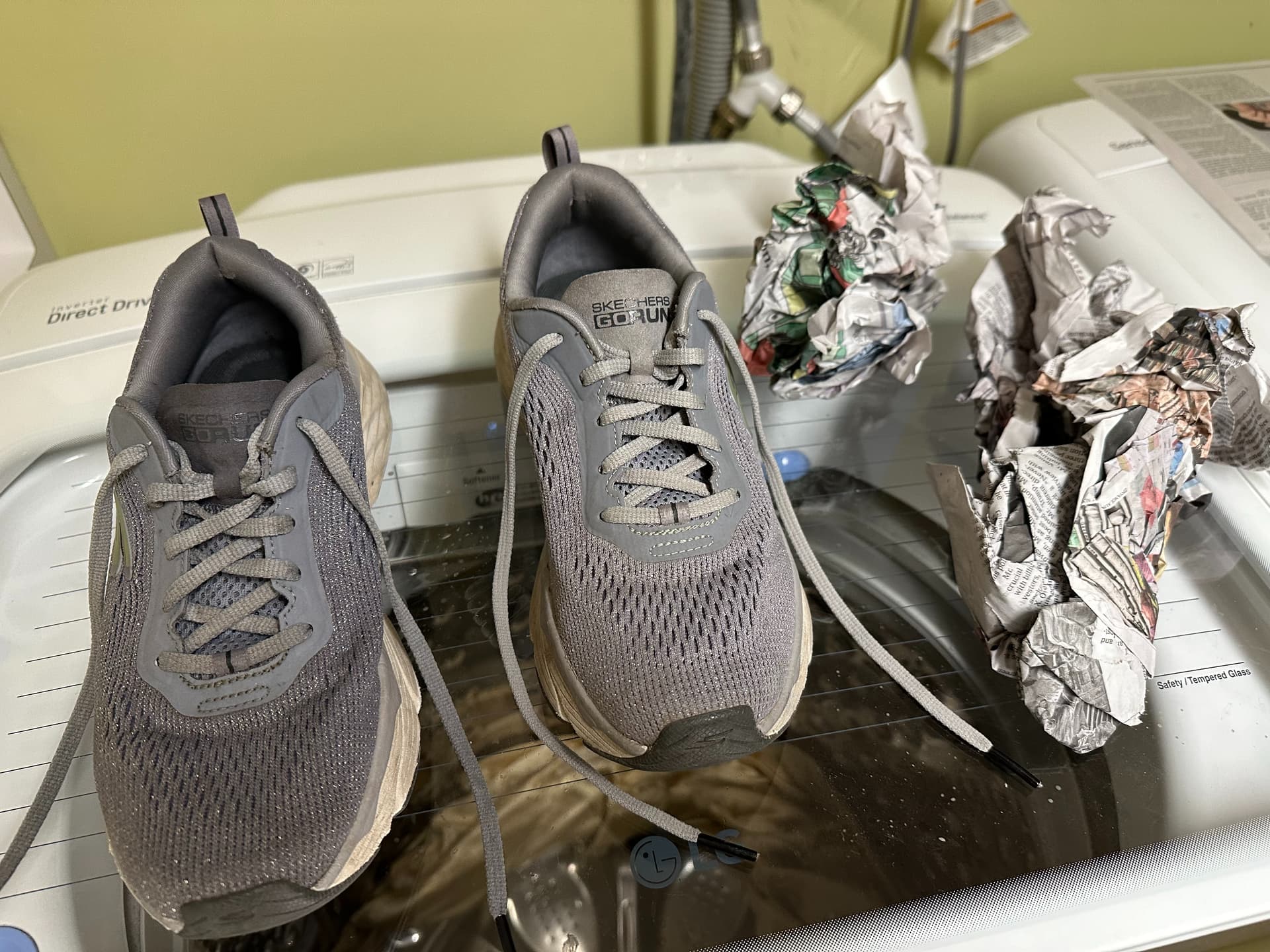 6:06p: One sneaker is stuffed with newspaper. Two double sheets and one single sheet (10 pages) are used.
