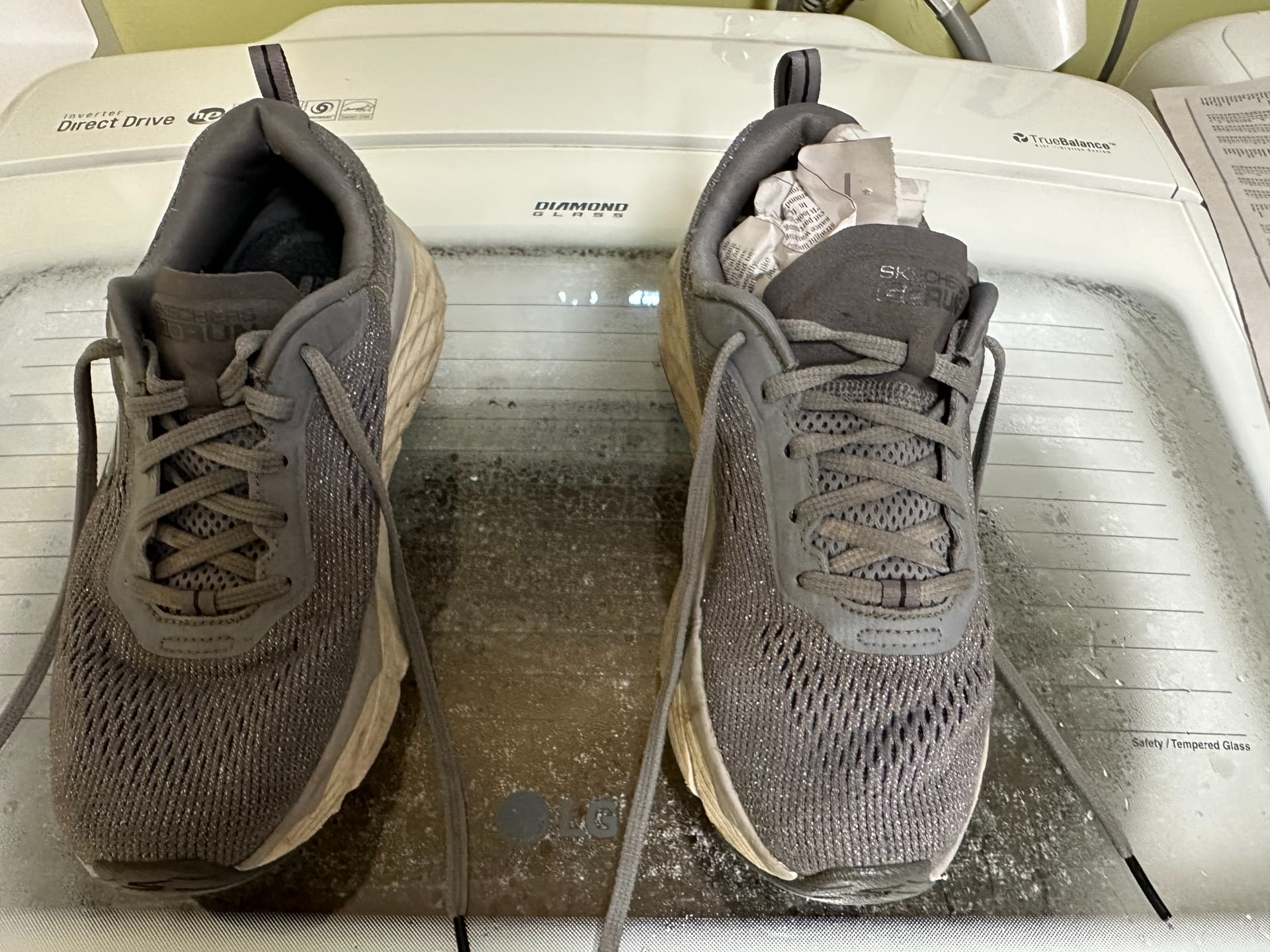 The sneakers will be observed tomorrow morning to compare levels of dryness. Observations will continue at intervals throughout the day, and the following day(s), until both sneakers are completely dry.