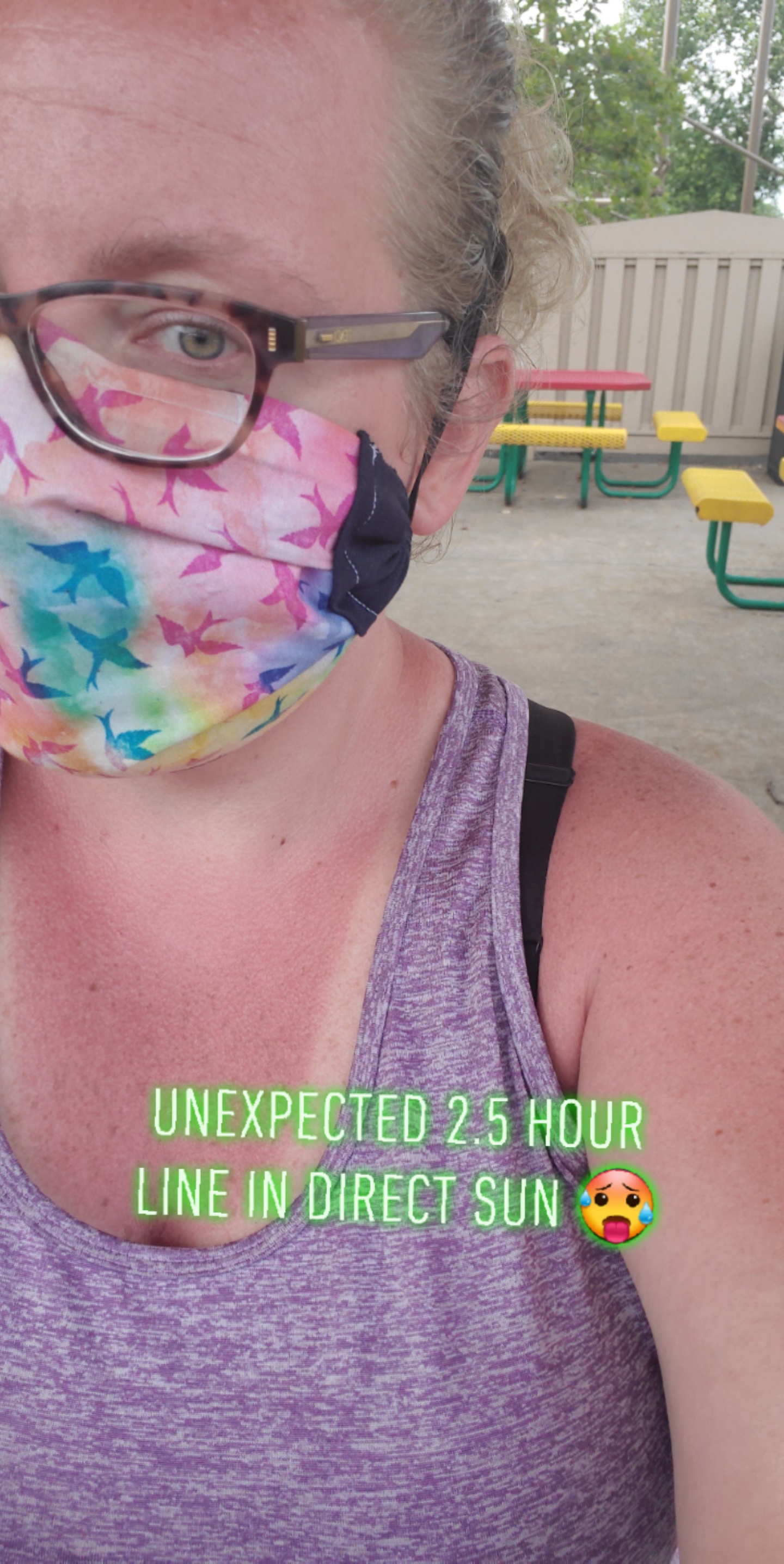 Mid-80s, humid, and sunny. Masked all day, though we took frequent 5-10 minute drink breaks. Somehow I didn’t wind up with a line from the mask during this horrible queue (for a Kali River Rapids type ride, only they dump whole waterfalls on your head… it never has a line and doesn’t even have a wait time sign due to huge capacity, but today they were only running 3 rafts due to staffing and COVID) but a worker showed me his, in just 3 days since they opened.